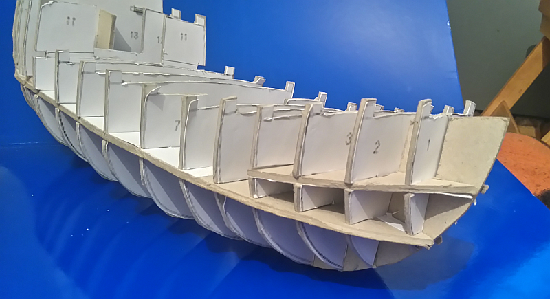 Odnośnie samej konstrukcji szkieletu, który pokazałeś, to mam nadzieję, że jest to jedynie jakaś luźna koncepcja na temat szkieletu, a nie jego właściwa wersja. Na tak cienkich podstawach, do tego poskręcanych nie zbudujesz żadnego okrętu. Szkielet musi zostać wykonany co najmniej z tektury o grubości 1 mm i wymaga dobrego spasowania elementów. Dobrze wykonany szkielet stanowi bowiem o jakości późniejszej bryły kadłuba. Proponuję zakupić oryginalne wydanie modelu, nie kombinować ze ściąganiem planów niewiadomej jakości, ewentualnie, jeśli wycinanie szkieletu uważasz za nudne i niepotrzebne zajęcie kup szkielet cięty laserowo. Zaoszczędzisz czasu i nerwów.