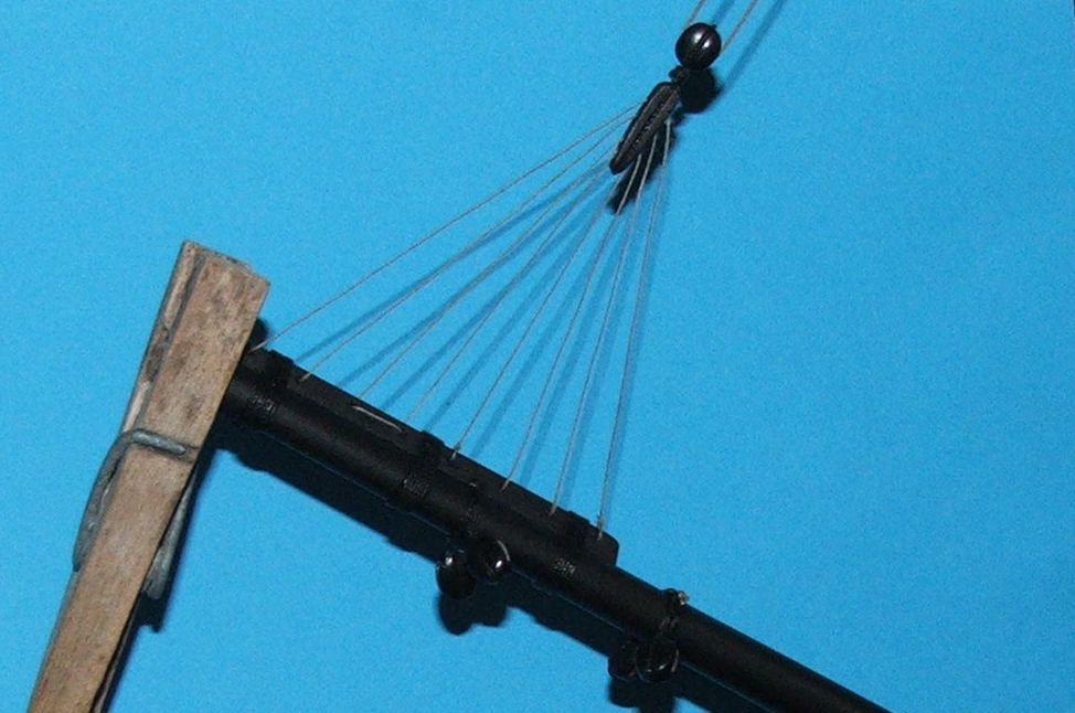 Główne reje powieszone bez całego takielunku .Potem wieszam następne poziomy .Po zawieszeniu wszystkich rej będę mocował szoty,halsy i całą resztę.Muszę najpierw mocować liny które odkładam przy maszcie.To dłubanie pomiędzy linami jest mocno wkurzające.Pozdr.R