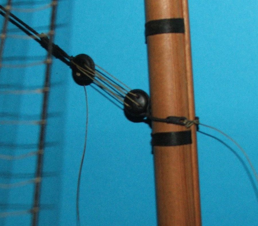 Dzięki dopingowi Mateusza wykonałem lewoskrętne sztagi.Nie bez problemów ale wyszło.Jeszcze ostatecznie nienapięte bo po wstępnym naprężeniu następnego dnia zwisały smętnie.Teraz przechodzę do stengi i bramstęgi i tu mam problem jak je odłożyć i gdzie.Są to liny o średnicy 5 i 6cm a więc sztywne.Przez bloki czy bezpośrednio na naglach,do pokładu ale jak.Może macie gdzieś w literaturze jak to robiono w Anglii w 17W.R