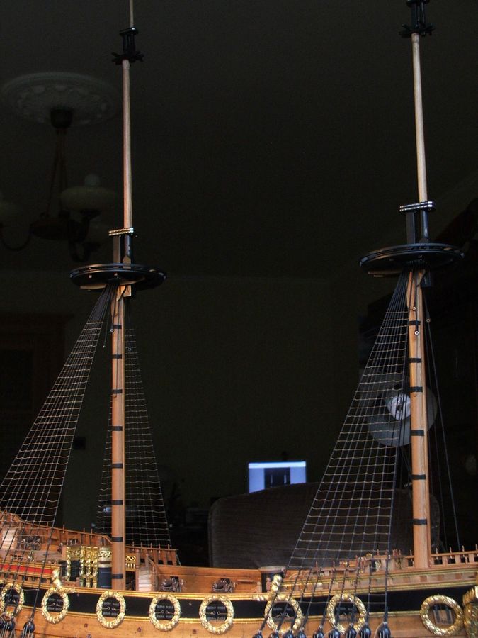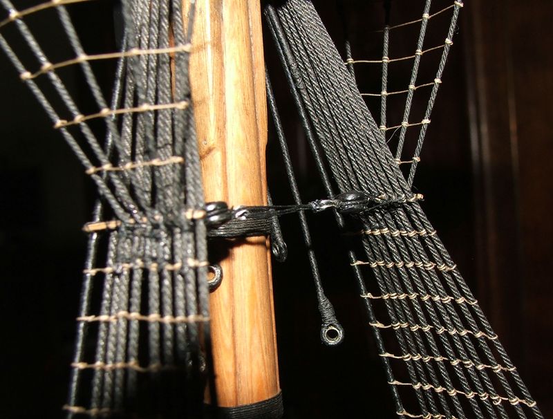 Męki ciąg dalszy.Wszystkie maszty sklejam w całość przed montażem na okręt.Łatwiej mi na kolanie pasować i montować .Jest trochę pasowań aby maszt był pionowy , nie poskręcany i miał właściwą geometrię.Potem wszystkie montuję i pasuję tak by były w osi symetrii pokładu i były właściwie powychylane.Przy następnych wantach już zostawiłem luz na jufersach do ponownego napięcia.Po wydawałoby się mocnym napięciu want po kilku dniach siadły i napiąłem je ponownie już właściwie.Pozostało żmudne i nudne wiązanie wyblinek.Kilka tysięcy węzłów.Dobrze że tą monotonię przerywam pracami domowymi.Porządki na ogrodzie i przebijanie komina który się zatkał od palenia drewnem.Straciłem nadzieję że się przebiję i będę musiał wybić dziurę.Model stoi w bibliotece bo w warsztaciku nie byłem w stanie już nic zrobić.Jest to kawał kajaka.Pozdrawiam R.