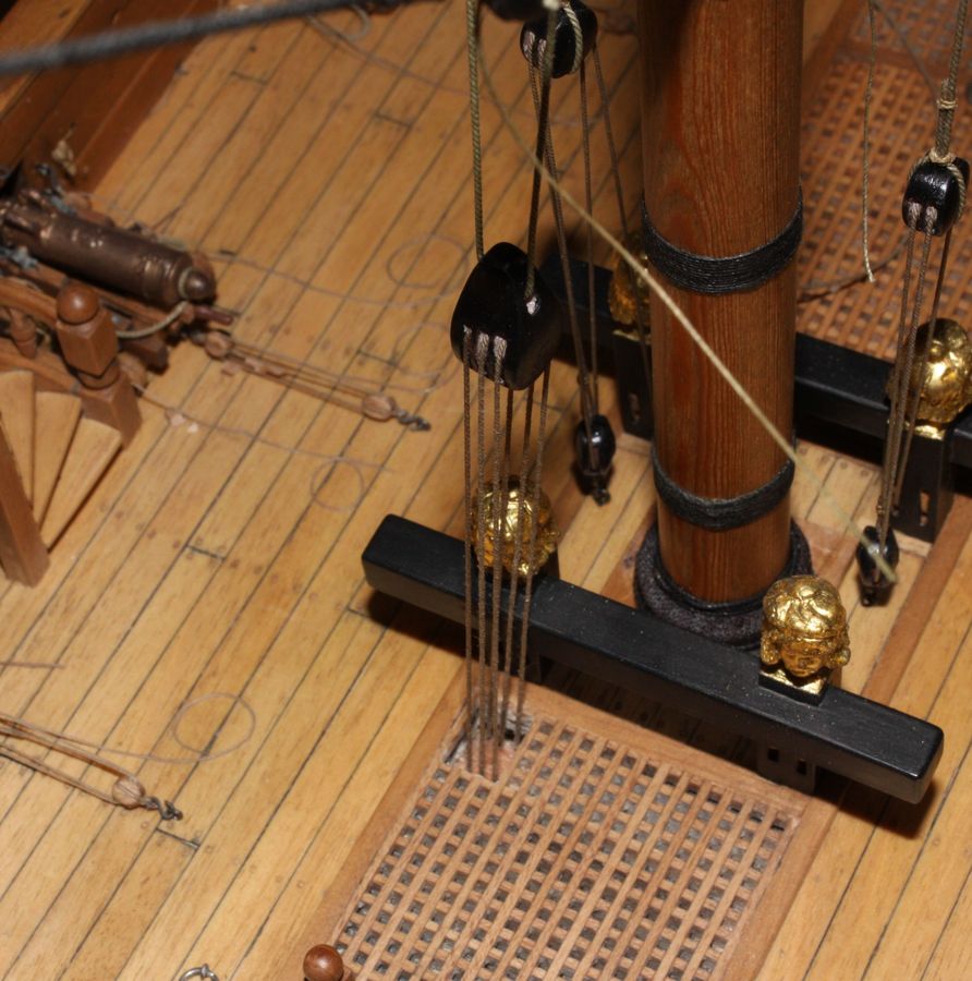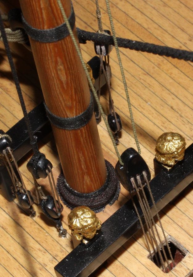 Prace remontowe uziemiły mnie na długo .Trochę jednak dłubię .Zamontowałem reje i wieszam bramreje.Nie dawało mi spokoju zwieszenie rej.Rozwiązałem to przez zastosowanie 2 podwójnych bloków.Prawidłowo liny bloku powinny wchodzić pod pokład.Zapomniałem o wykonaniu otworów w pokładzie stąd takie kombinacje.W końcu zdecydowałem się na poprawkę .Wycinanie otworu pomiędzy linami to masakra.Wykonałem taki zespół naprawczy imitujący pachołek i wsunąłem pod pokład.Jak by ktoś zapomniał to może tak rozwiązać.Ciekawe czy taki otwór był zabezpieczany przed zalaniem wodą z pokładu.Nie udało mi się znaleźć żadnej informacji może wy coś macie.R