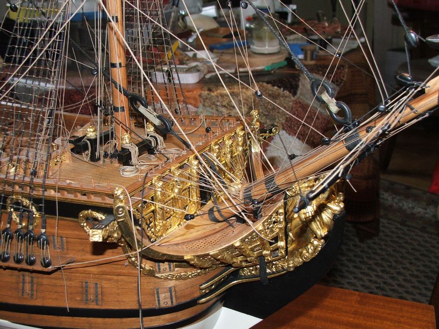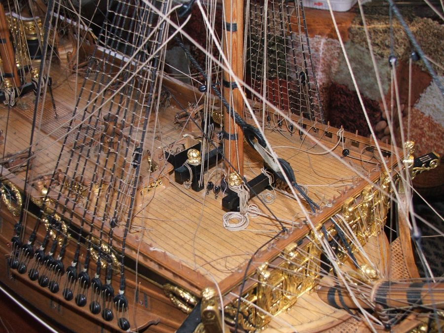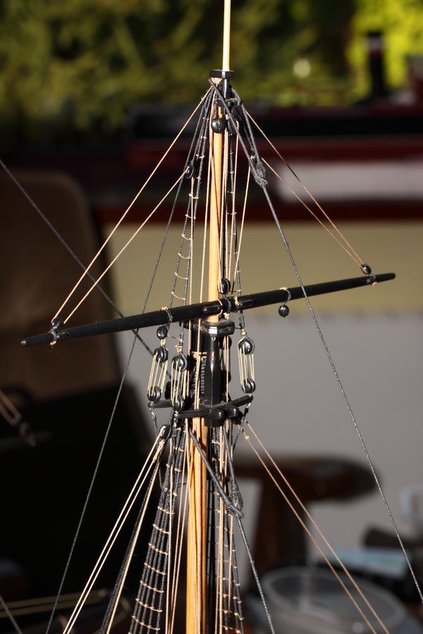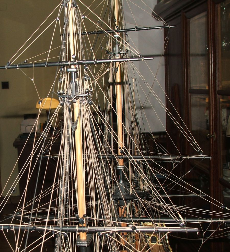Uf olinowanie zakończone.Na pokładzie bałagan bo liny nie są ostatecznie zacumowane.Teraz się sezonują.Zimą jest powietrze suche to linki zwisają a latem jest wilgotne to się napinają i trzeba wybrać napięcie optymalne .Bojki kotwic wytoczone z drewna w obejmach z lin.Jeszcze flagi,latarnie i kupa innego osprzętu.Pozdr.R