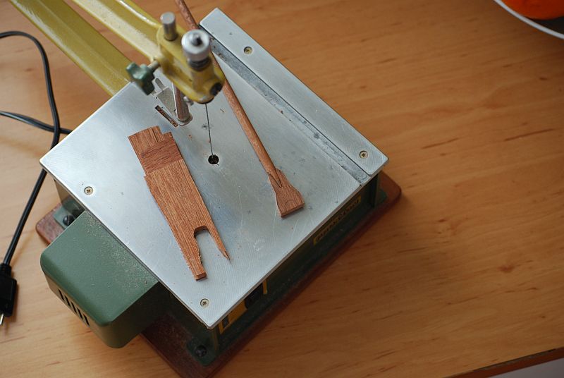 Wykonałem elementy do powieszenia żagla gaflowego. Zrobiłem własną sklejkę z forniru mahoniowego 0,5 mm sklejając prostopadłe przebiegi słoi aby podczas obróbki nic nie pękło. Podarowałem sobie już składanie z dwóch elementów. Jak0 przymiar potraktowałem dodany przez producenta odlew. Jak miałem zamontować 2 mm odlew do rei grubości 6 mm ???
