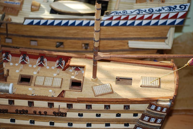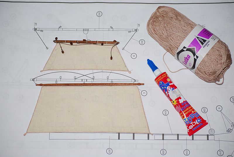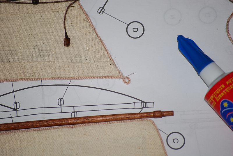 Powstają żagle znaną metodą z relacji Galeonu czyli klej magic ( jestem w szoku że klej jest cąłkowicie nie widoczny i nie robi żadnych przebarwień i trzyma i jest elastyczny jakby go nie było ) czeski kordonek za 3 zł w kolorze śmiesznym ale pasującym tak mi się wydaje. Zrobiłem bejce do barwienia obłędnie białych bloczków na kolor zbliżony do koloru jasnego mahoniu , względnie mocno zaolejonanej gruszki. Bardzo to pracochłonne z tym uzbrajaniem żagli. I czaso-chłonne. Ale przyjemne oderwanie od jufersów podwięzi i ław wantowych. Żagle firmowe occre mimo że materiał bardzo fajny to uszyte byle było. Odległości brytów za duże. Bezsensowne potróje zakłady materiału - wystarczyło ściąć narożniki przed szyciem i byłoby cieniej. Ale trochę się podrasuje i będzie ładnie.