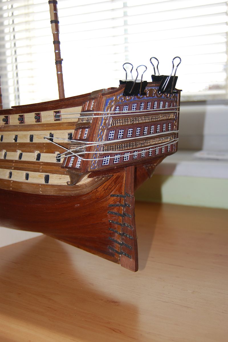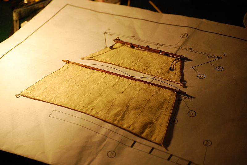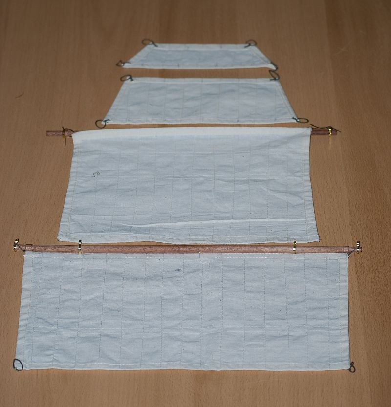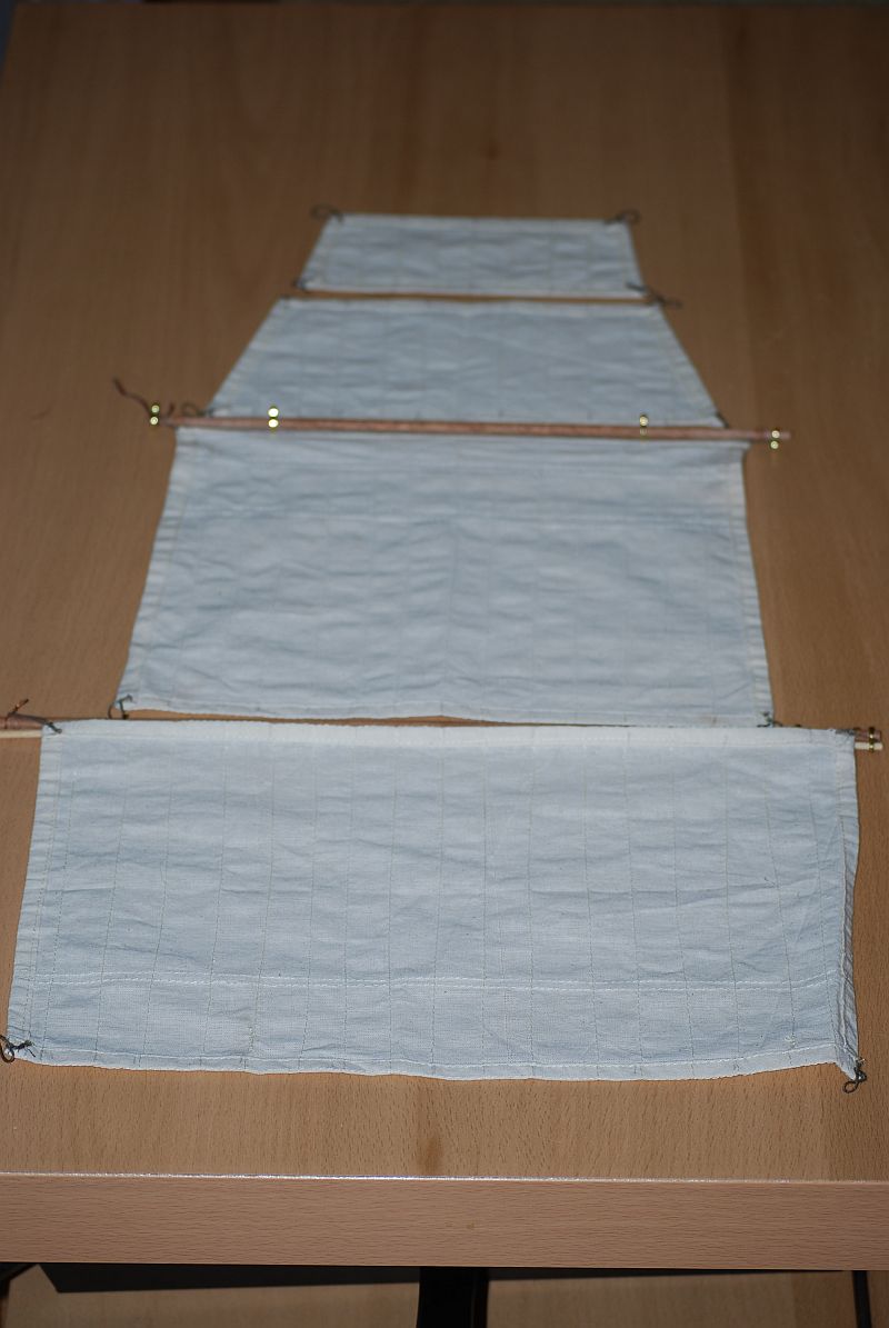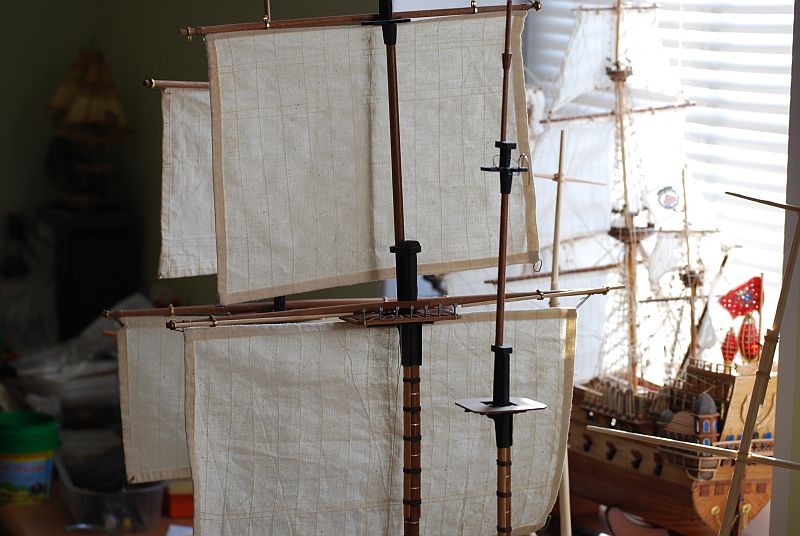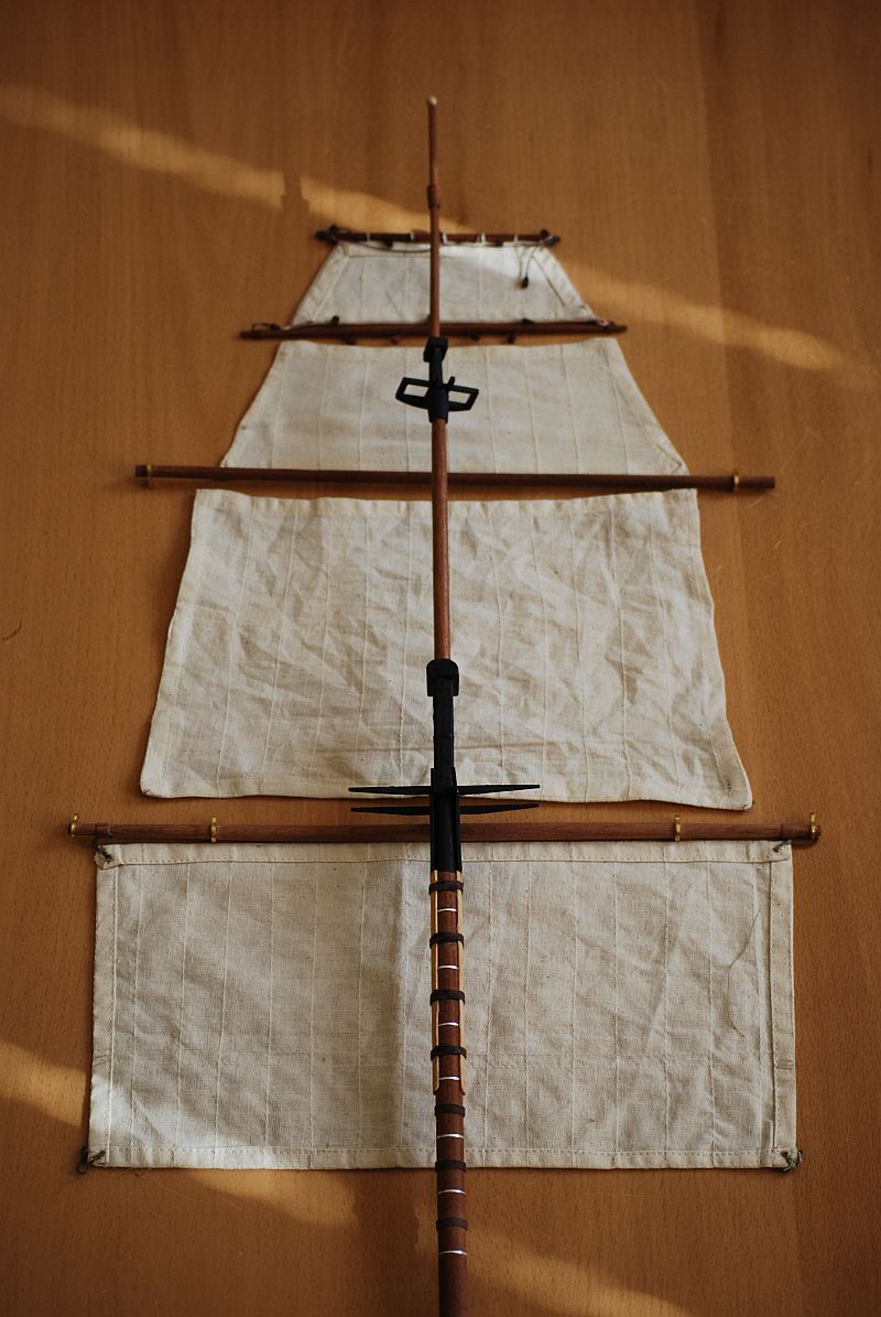 Odnośnie żagli to zdaje się że powinny tworzyć coś w rodzaju piramidy. Jednak wychodzi że są braki. Na szczęście udało się na mokro trochę płótno naciągnąć . Resztę braku ukryje się mam nadzieje profilacją żagla.