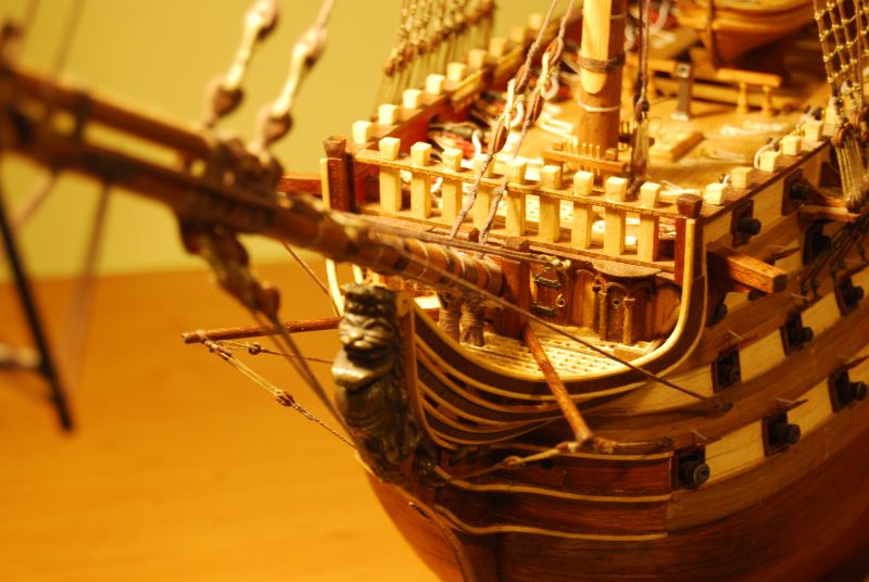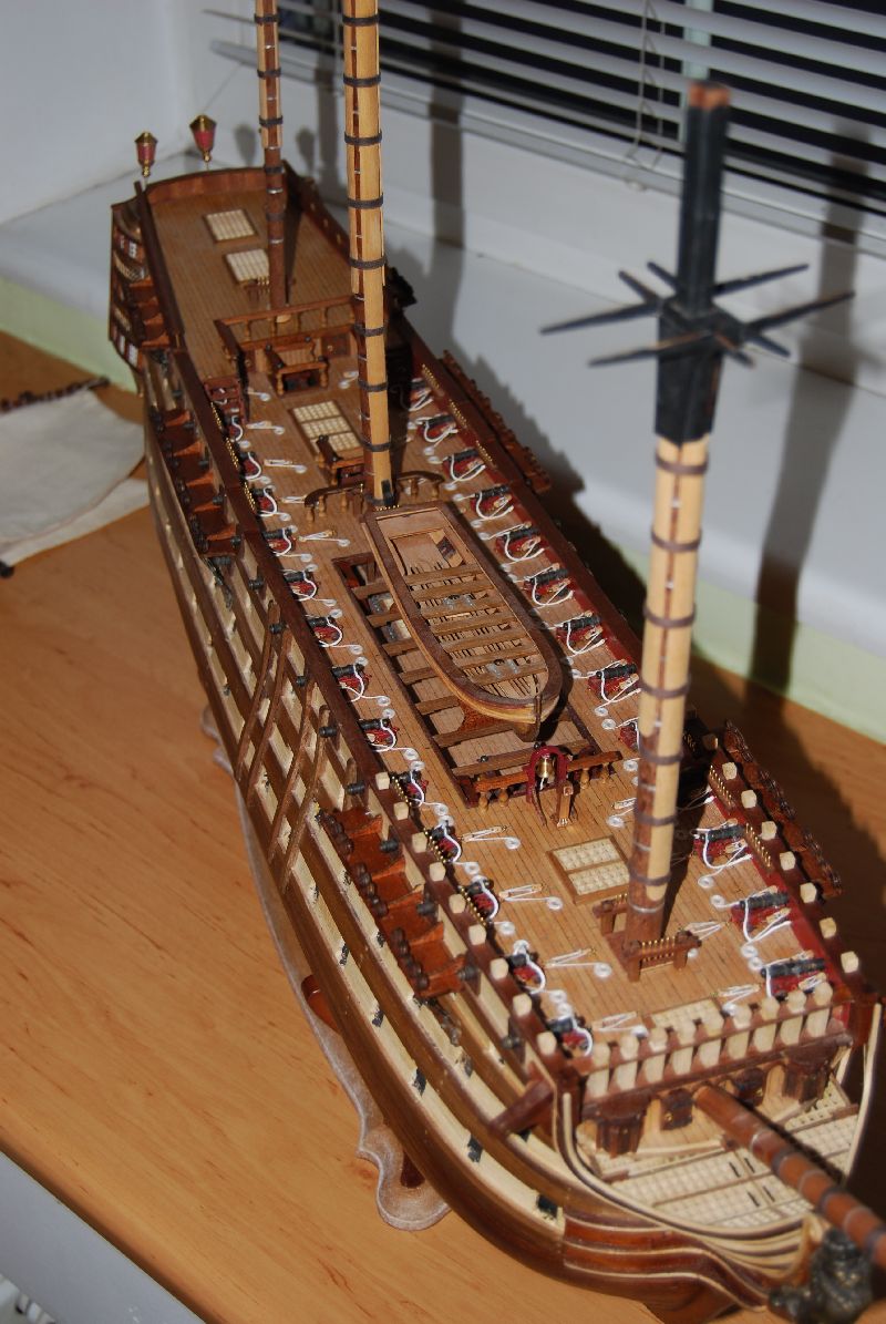 Podsumowanie działu. OCCRE dało bandery nieformowalne, przy próbie nasączenia jakimkolwiek utrwalaczem typu lakier do włosów bądź już zwykłe namoczenie poprzez przesiąknięcie kleju, farba zostaje na palcach a na samej banderze zostają zgrabnie zdjęte linie papilarne, banderę zatem odmalowywałem po godzinnej walce z formowaniem - efekt średni ale ujdzie w tłumie, lepiej było zrobić własną od podstaw bo ten czerwony koło czerwonego nie leży.Jest to pomarańczowy - róż. Małych jufersów zabrakło 6 sztuk dwie zgubiłem więc razem osiem, a dużych zostało z 10 czort wie po co + jeden pęknięty, dodając jeden nadprogramowy żagiel który nie wiem gdzie miąłbym założyć wychodzi na to że niespecjalnie OCCRE się przykłąda, o braku podstawki która kupiłem na Allegro od zesstawu DA nie wspomnę. Choć mają maszynę do cięcia wodą i tu duży plus .Bloczków też będzie za mało jeśli wykonujemy model zgodnie z planami a nie dokumentacją Occre. Ja się posiłkowałem tymi co zostały mi z innych budów no i dorabiałem wlasne. Część rzeczy w ogóle nie została uwzględniona. Coś tam niby jest narysowane ale nic nie widać co i jak a wytłumaczenia tez nie ma. Furty armatnie poza krytyką , niedolane klapy powyszczerbiane 10 w ogóle się nie nadawało do założenia bo były szczątkowe ( OCCRE ambzury dało co do sztuki - czyli ktoś to liczył i miał w rękach, bo jak były niedolane to na wadzę powinno być jedno lub dwa więcej) Klap za to zostało 10, zrobiłem wielki błąd że nie opracowałem otworów jak należy - boli mnie to sromotnie. Starałem się tak zrobić żeby nie rzucało się te metalowe badziewie w oczy . Dokupiłem paczkę furt AMATI, zupełnie inna bajka , choć też blachówa. Są błędy w podwójnych a pojedynczych bloczkach w dokumentacji. Linki 0,5 jest na styk. 0,8 zostaje szpulka - prawie 2 . Za to zostało mi 2 metry łańcucha który miał być podwięziami. Podsumowując wiele czasu się traci na dojście co i jak na równi z własnym wykonywaniem z planów albo i jeszcze więcej. Ogólnie z efektu jestem zadowolony. Ten zestaw można określić mianem sterty klapek z której " coś " można zrobić. Myszor myli się że to tylko postykać. Większość trza przerabiać i dorabiać.