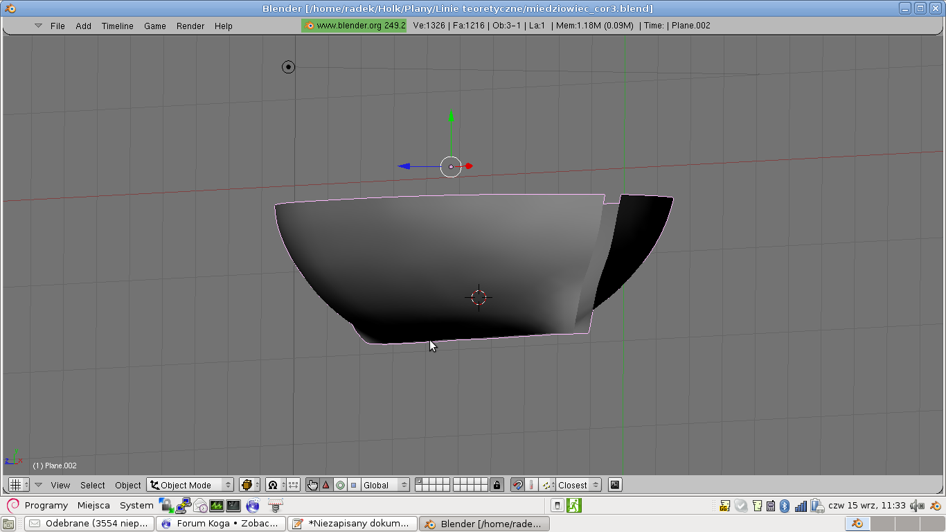 Przeskalowałem swoego holka w Blenderze do takich rozmiarów, jakiego mam go w skali. Każdy rzut wręgi mam na siatce, więc na brystolu narysowałem sobie siatkę i przeniosłem punkty przecięcia z siatką: