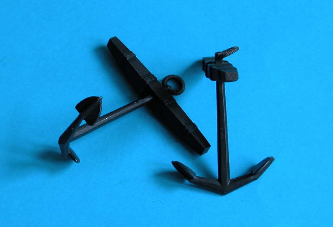 Szczęśliwie kształt i wymiary kotwic pokrywały się z dokładnością do 0,5 mm z typowym odlewem dostępnym w sklepie internetowym http://www.modelarstwoszkutnicze.com. Uniknąłem dzięki temu konieczności ich odlewania. Wystarczyło lekko dopieścić iglakami, dorobić nową drewnianą belkę i kółko.