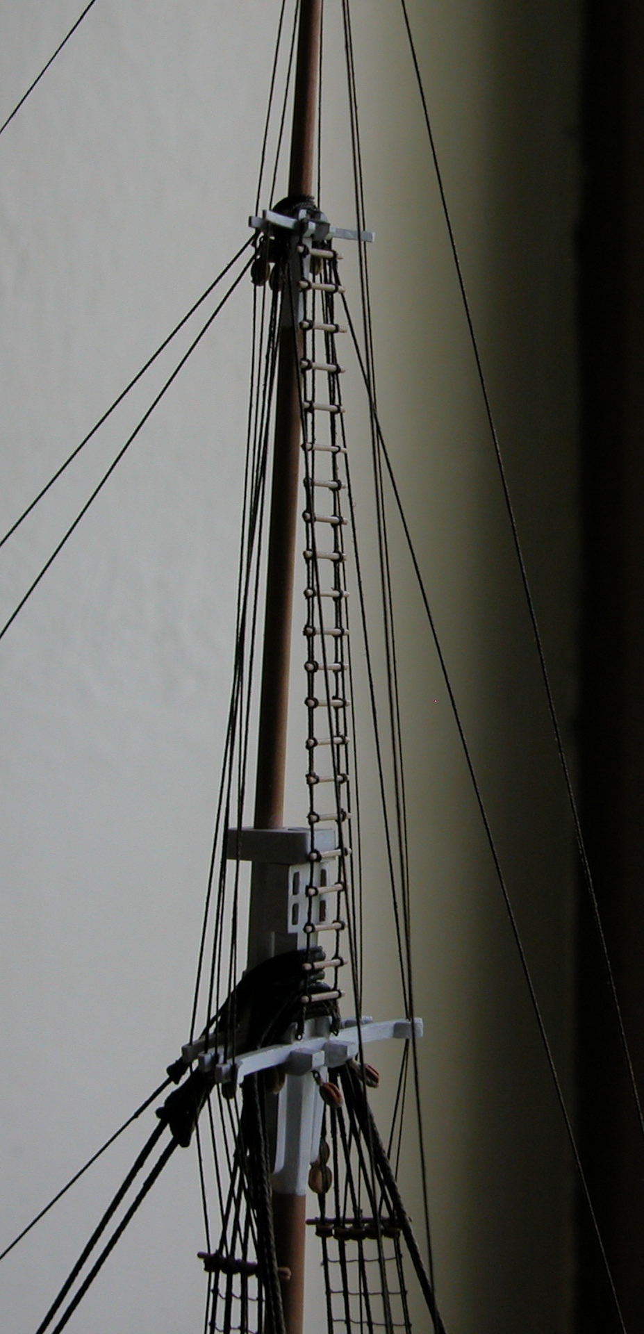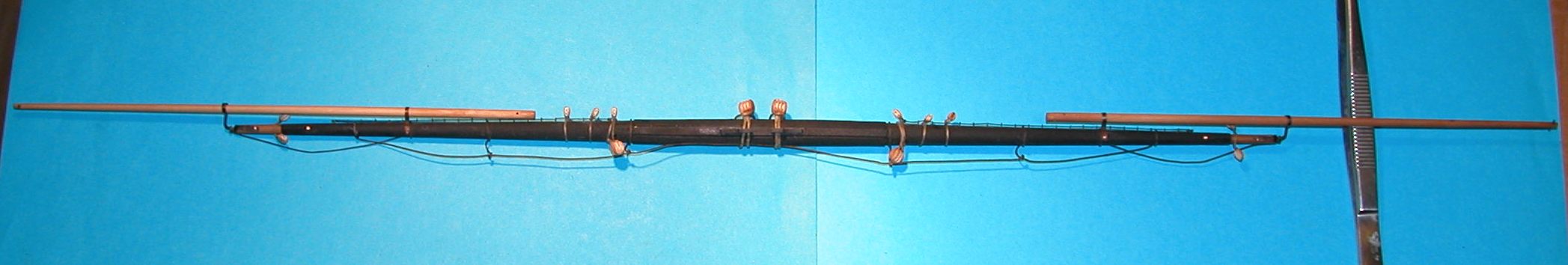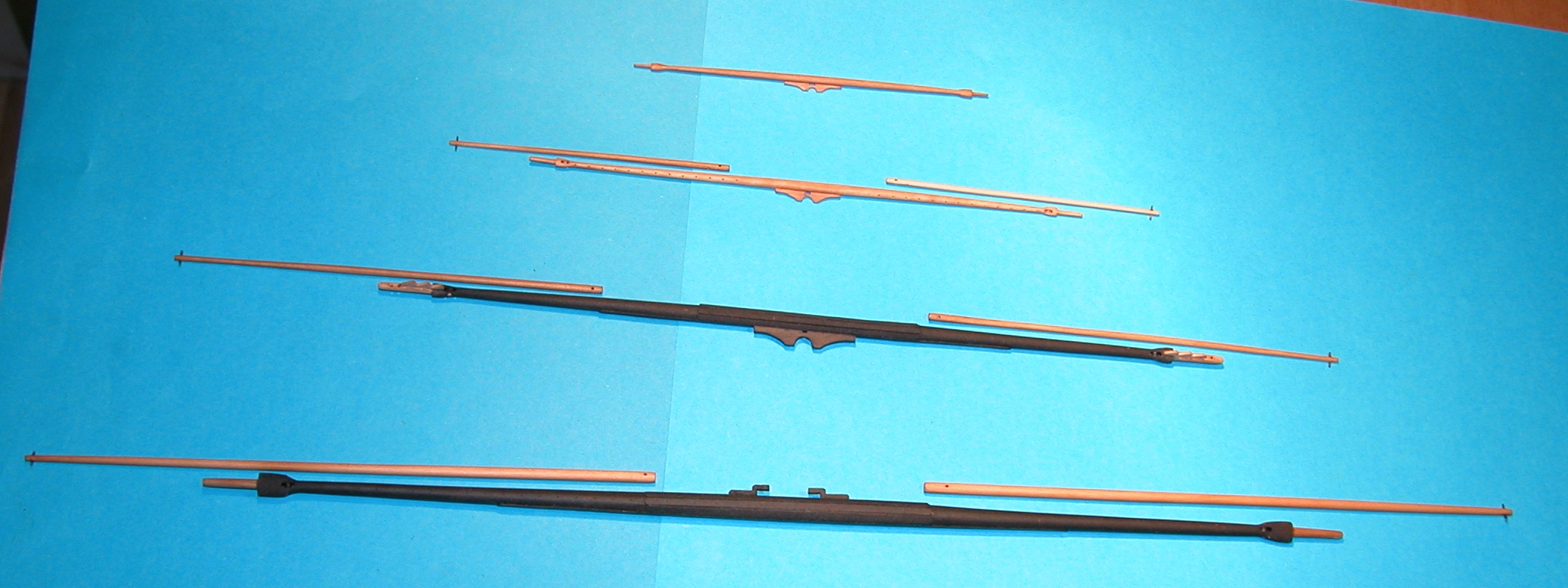 Trochę się rozpędziłem i zacząłem również okucia noków bombramsrei. Szczęśliwie niepotrzebnie (na tejże nie ma bowiem wytyków), bo prawdę powiedziawszy nie bardzo wyobrażam sobie w jaki sposób wlutował bym w nie wysięgniki z tulejkami. Takich zdolności i umiejętności jak Andrzej Korycki (pozdrowienia) – niestety nie posiadam.