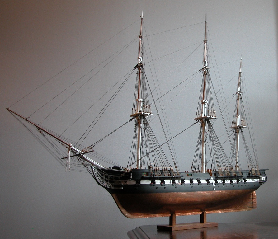 Po bliższym przyjrzeniu się arkuszom zdecydowałem się na budowę „mieszaną”, z dwóch podstawowych powodów: proponowane w wycinance drzewca, ze zwijanych w rurkę kartoników, uznałem za nie do przyjęcia. Drugi powód, to wersja modelu sprzed przebudowy (nie czarna), uznałem ją za nieciekawą. Zdobyłem dokumentację amerykańską, uznaną przez wielu modelarzy za najlepszą i postanowiłem zmierzyć się z wykonaniem, opierając się na niej. A zatem, kadłub poszyty jest / będzie papierem z wycinanki, lekko waloryzowanym, pokłady z kartonowej wycinanki, „patyczki” jednak drewniane – jak najbardziej zgodne z dokumentacją amerykańską. Działa chcę wytoczyć, a nie sklejać z wycinanki, gretingi mam wycięte laserowo, patyczki w 70 % już wykonałem, a takielunek ma być prawdziwy, choć pewnie z mniejszą ilością szczegółów z uwagi na skalę (1:100).