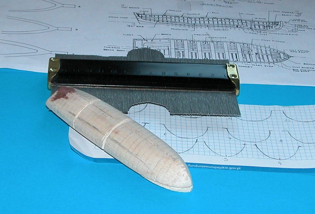 Zmuszony okolicznościami zabrałem się za szalupy. Początkowo chciałem je wykonać metodą opisaną m.in. na KODZE przez Zbyszka Kowalewskiego. Jednak już wstępny rzut oka na plany zasygnalizował problemy: w opisie (i wielu relacjach z budowy tą metodą) wręgi szalupy wykonywane są z pasków forniru położonych płasko na kopycie i dają się dość łatwo „doginać” do jego kształtu, zaś na moich planach (i tak jest raczej w rzeczywistości) wręgi mają wymiar 0,4x0,8 mm i stykają się z poszyciem, a tym samym z kopytem, węższym bokiem. Przyciąłem sobie nawet odpowiednie listewki, ale próby gięcia ich (na zimno i gorąco, na sucho i mokro i we wszystkich kombinacjach) zakończyły się totalną klęską – listeweczki masowo pękały i nie było mowy, żeby je ustawić w odpowiednich miejscach i dopasować kształt.
