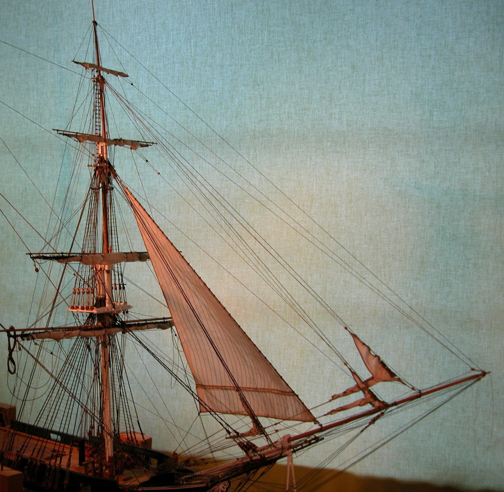 Po zamocowaniu brasów blindrei bukszprytu, kropelką CA przykleiłem do niej wolny lik kliwra. Dzięki temu wygląda on dość naturalnie: lekko wydęty i odchylony od osi okrętu, jakby wypełniony wiatrem: