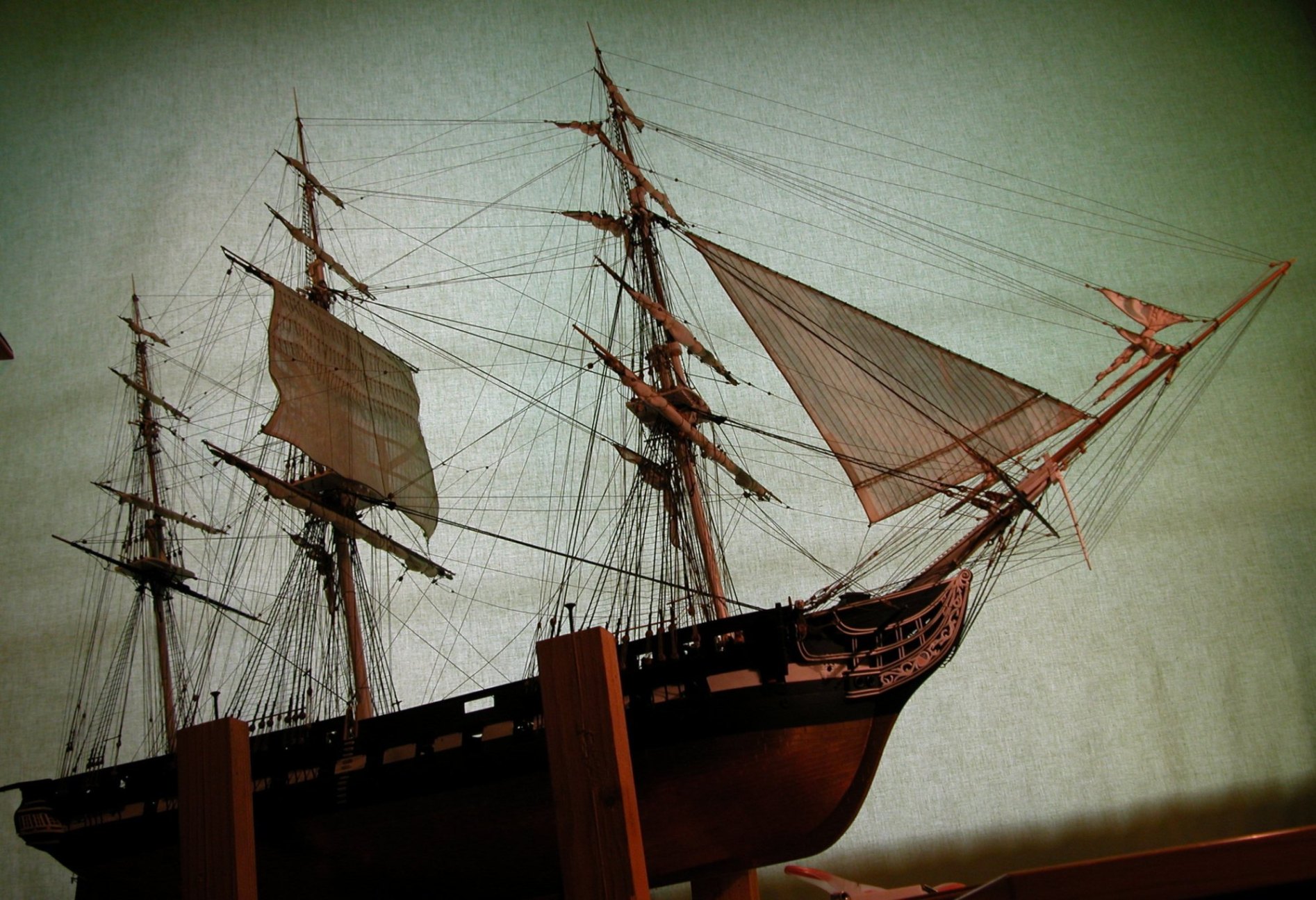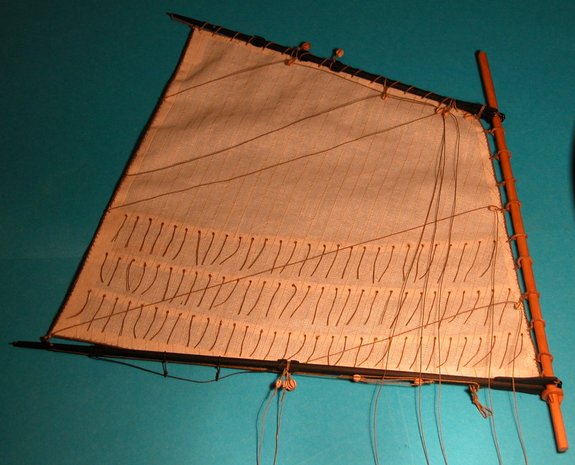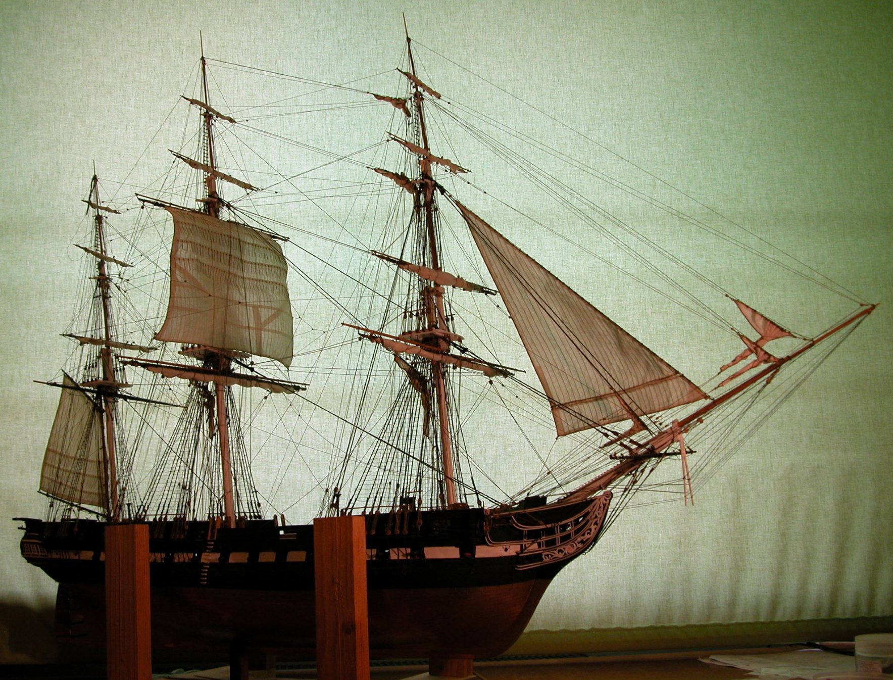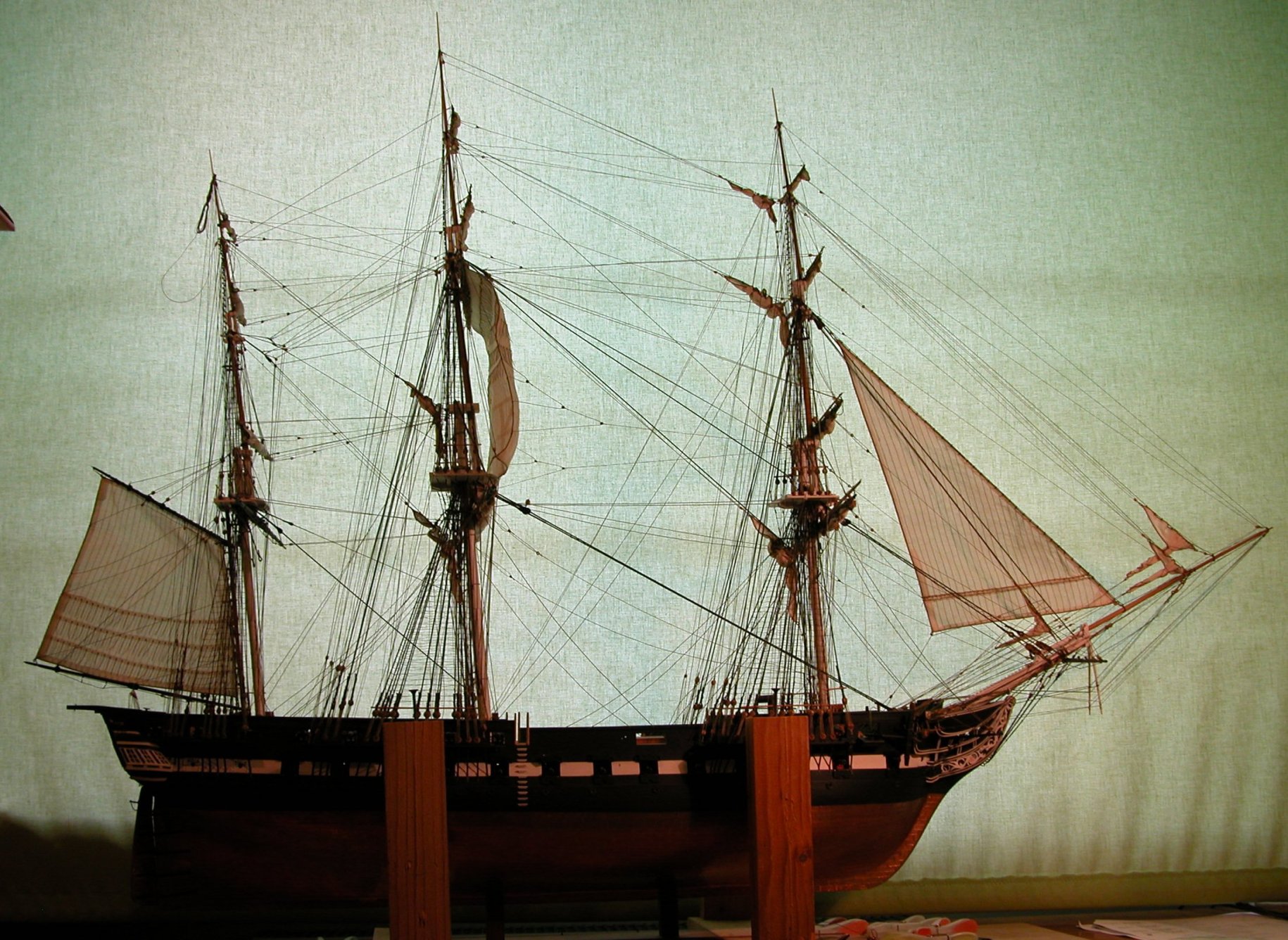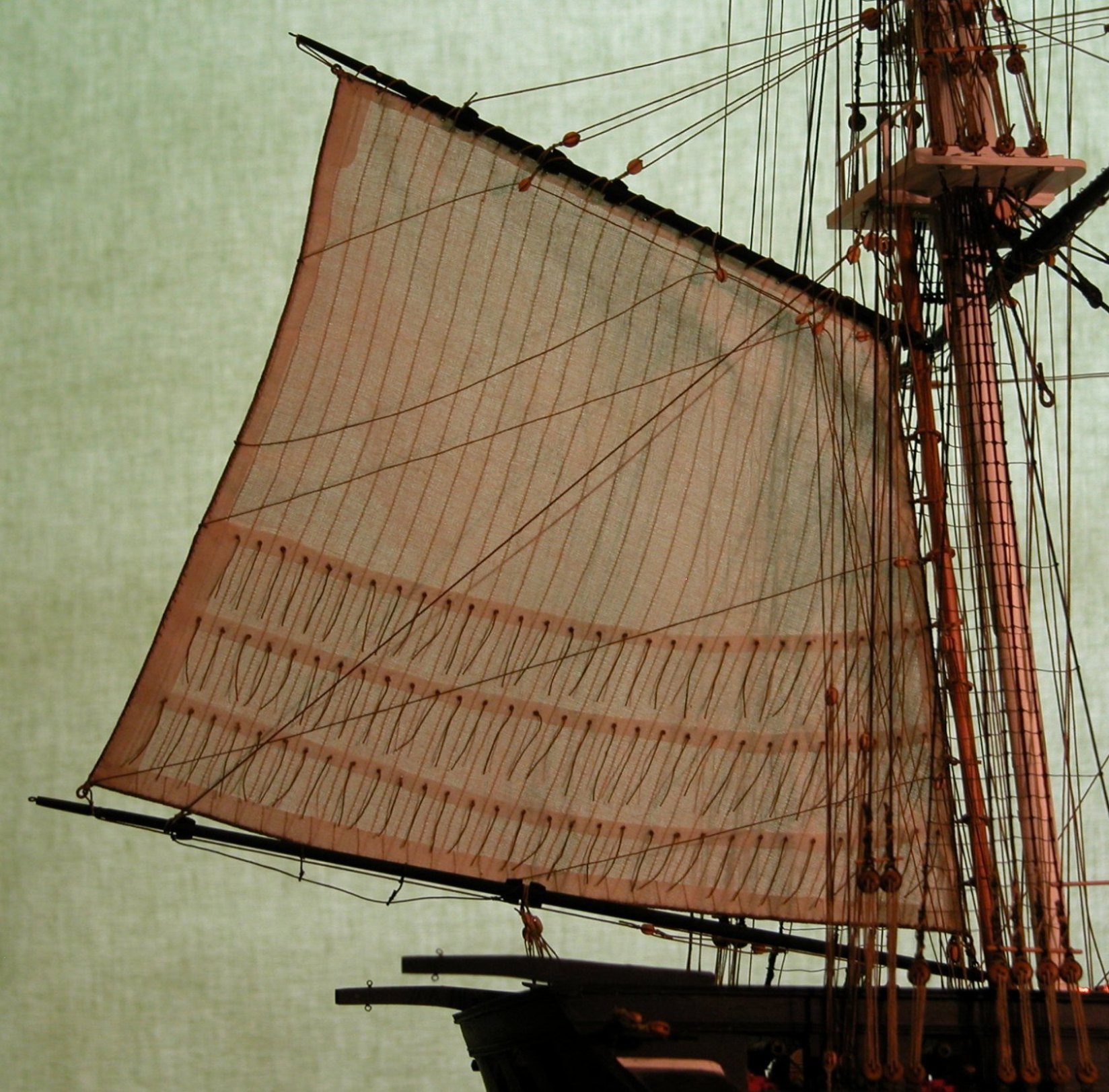 Uff, skończyłem żagle rejowe na bezanmaszcie. Pozostał tylko bezan (sterżagiel) i marsgafel. Jest nadzieja, że się wyrobię.