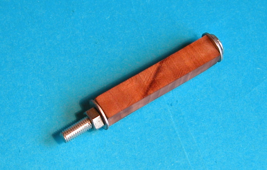 Zrobiłem więc tak: w kołeczku (starałem się dobrać kawałek o regularnych, równoległych słojach) wywierciłem prostopadle do słoi otwór o śr. 5 mm. W otwór wsunąłem śrubę M5 i ścisnąłem nakrętką.