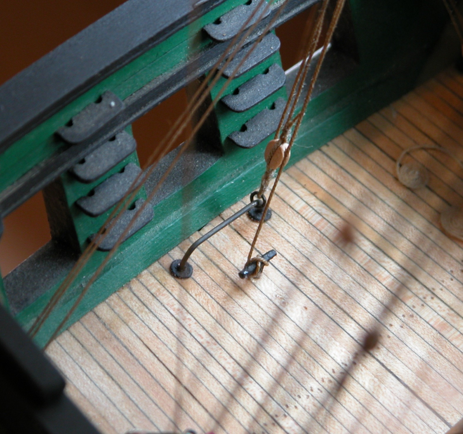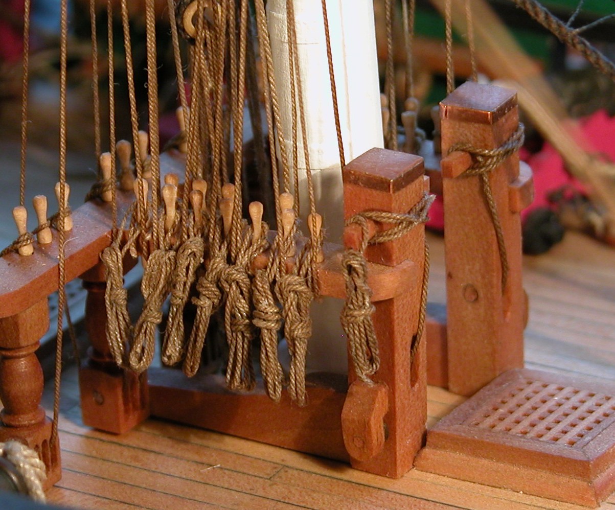 Budując z planów zawsze stajemy przed problemem kolejności montażu poszczególnych elementów. Przy budowie Constitution kilkukrotnie miałem ten dylemat. W tym przypadku i tak miałem ogromne trudności z dostępem przy mocowaniu linek na kołkownicach burtowych, szczególnie na wysokości want. Sądzę, że wcześniejsze zamontowanie siatek dostęp ten jeszcze by utrudniło, jeśli nie całkowicie uniemożliwiło. A już na pewno w czasie prac generowane byłyby kolejne "szkody". Pisałem już wcześniej o połamanych barierkach na marsach, ale nie wspominałem o kilku urwanych klapach furt działowych, jednej naruszonej lawecie i wyłamanym kole sterowym, które teraz muszę naprawiać. Sądzę, że siatkę uda mi się jakoś zamontować, choć pewnie byłoby łatwiej, gdybym miał już nawiercone otwory w relingu. No ale jak by ten podziurkowany reling wyglądał w czasie eksponowania modelu w Tczewie?