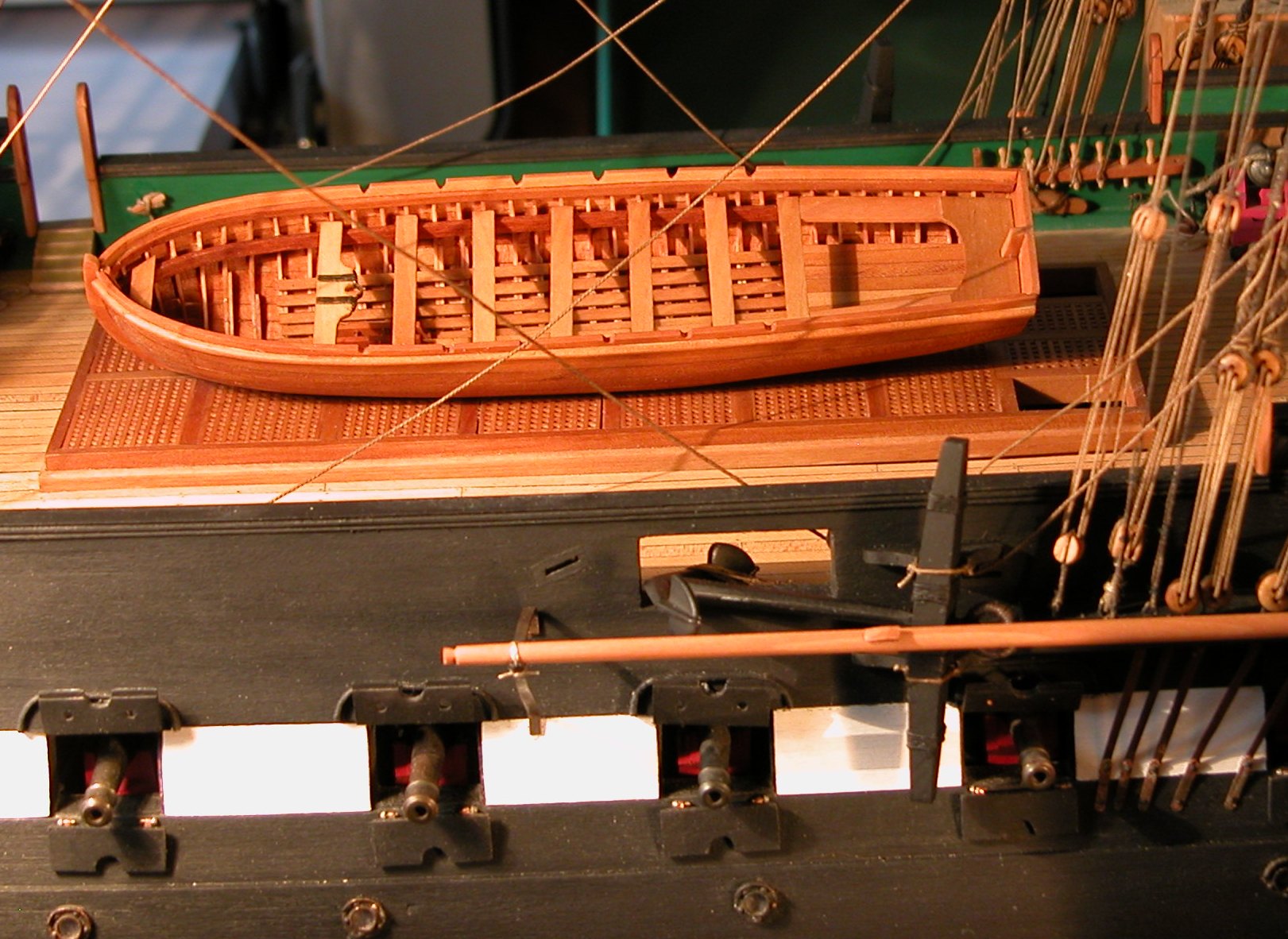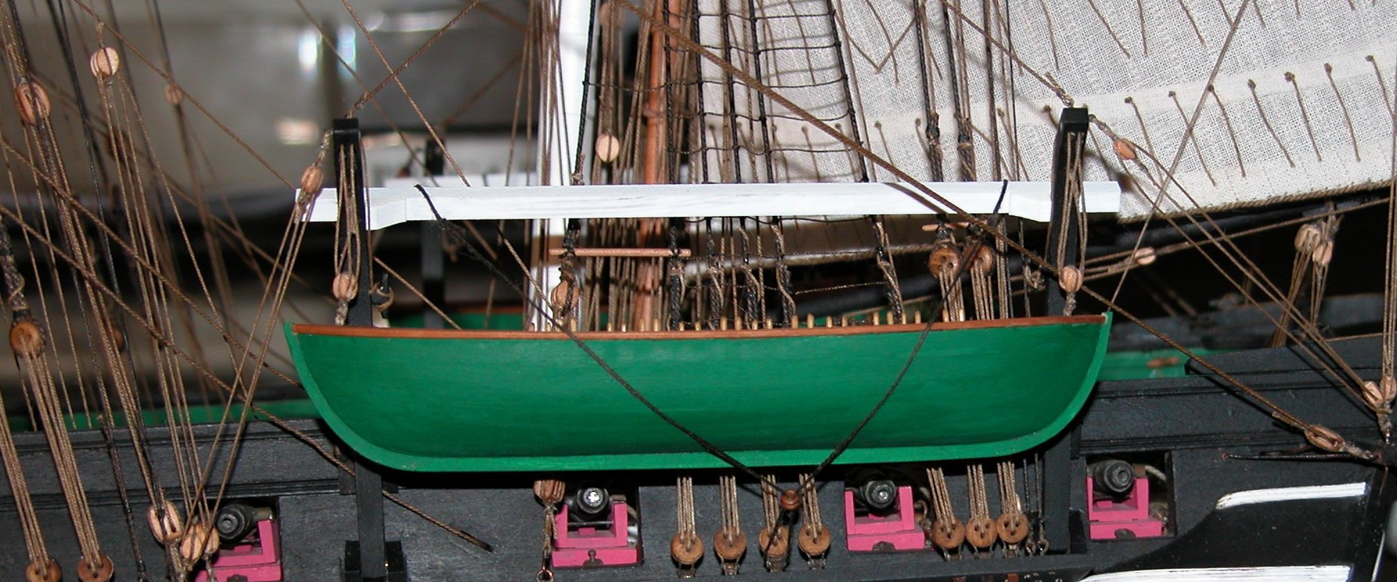 Szalupy wiszą, ale nie są wykończone w 100%. Potknąłem się na woreczkach podwieszonych do liny przebiegającej nad szalupą, a zawierających „linelife" (liny po których załoga dostawała się do szalupy spuszczonej na wodę??). Woreczki te mają w skali mojego modelu wymiar 4x6,5 mm. Próby uszycia ich z cienkiego batystu (tego z którego uszyte są żagle) zakończyły się porażką – to co wyprodukowałem nijak nie przypominało zgrabnych woreczków z oryginału: