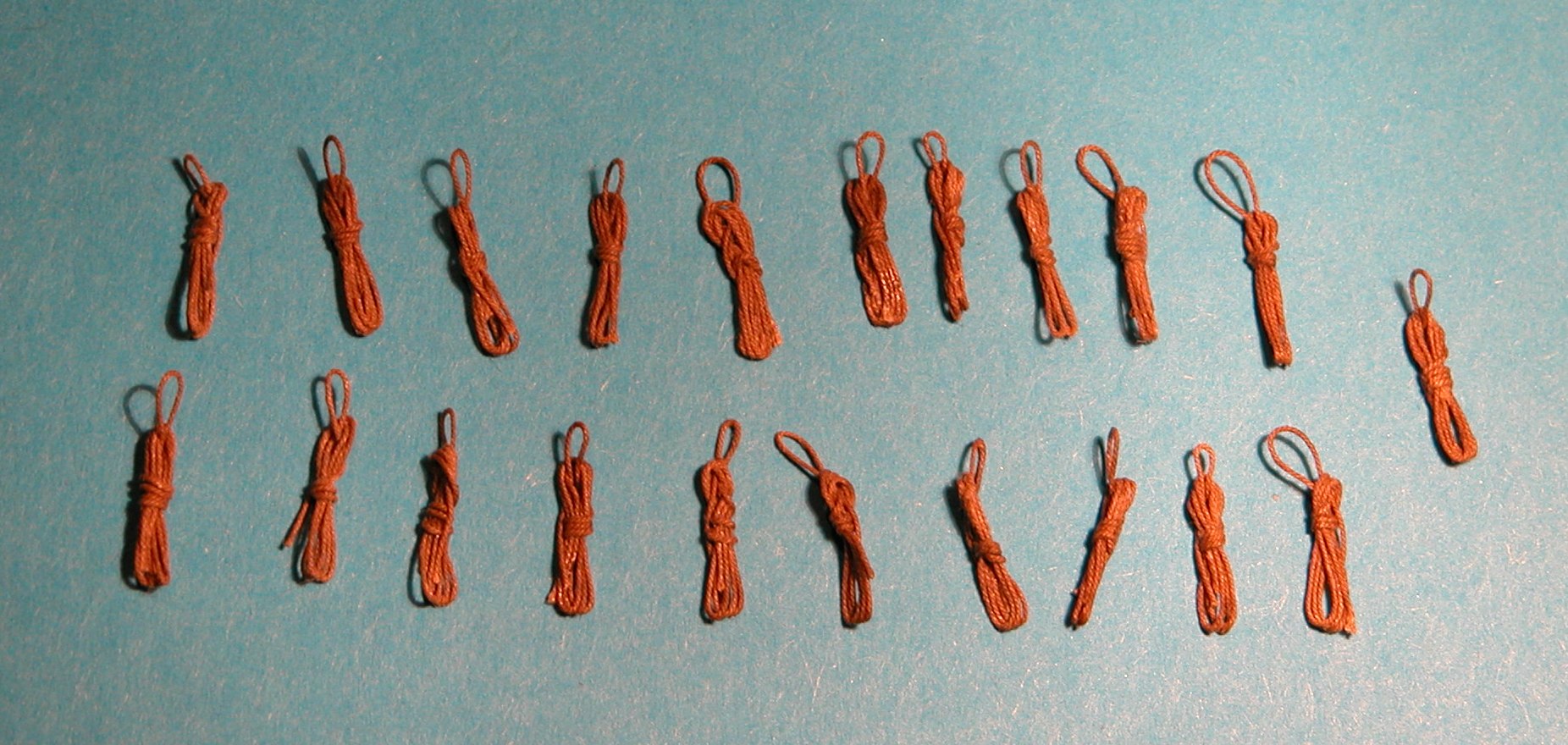 Zacząłem działać z buchtami - wykonuję je zgodnie z wcześniej publikowanymi opisami, np. w relacji Oksala. Ponieważ na kołkownicach obłożone są liny o różnej grubości, to i buchty powinny być takowe. Tu z linki 0,3 mm: