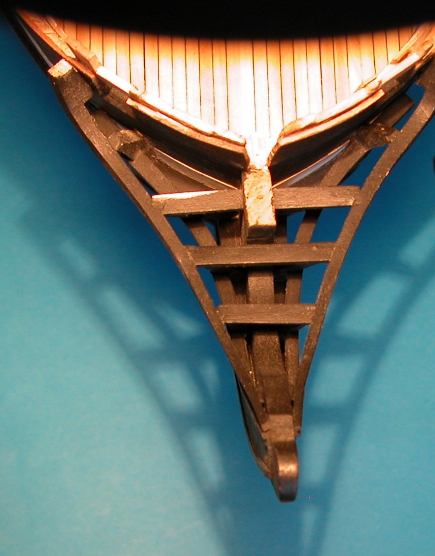 Kolejnym krokiem winno być poszycie pokładu działowego i tu mam problem. Zgodnie z teorią, w części dziobowej, listwa stykająca się z „waterway” winna mieć wcięcia pozwalające na to, aby kolejne deski pokładu nie kończyły się w „szpic”. Rozwiązanie takie było wielokrotnie pokazywane na „KODZE” i znajduje się m.in. w „USS Constitution - Anatomy of the ship”.