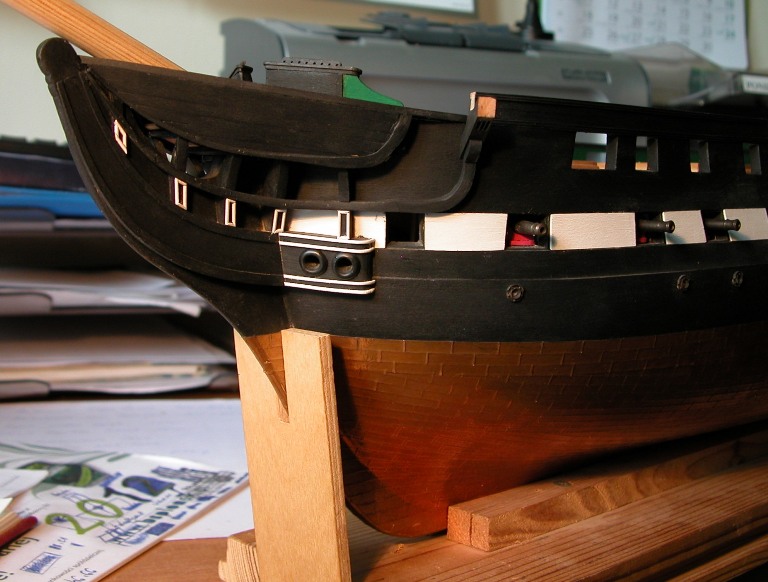 Mnie też szkoda. Chociaż podglądactwa w zasadzie nie popieram, ale może bardziej tu chodzi o "zaglądactwo". Myślę więc nad sposobem zdejmowania głównego luku, co pozwoliłoby choć troszeczkę zajrzeć go środka. Wyjmowany luk to nie problem. Kłopot polega na tym, że na owym luku zamocowane będą dwie szalupy, zatem muszę wymyślić "patent", który pozwoli na w miarę stabilne związanie luku z okrętem po umieszczeniu go na miejscu i jednocześnie łatwy demontaż.