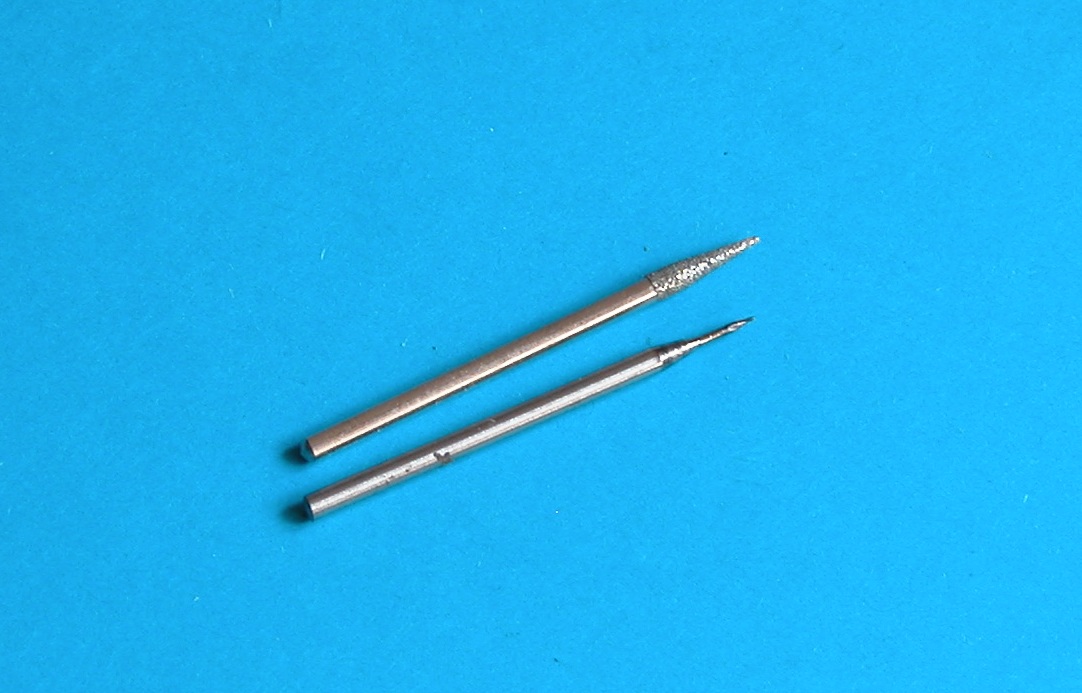 Niestety szczelina była tak wąska, że o wygładzeniu nierówności iglakiem nie było mowy. Zastosowałem zaadoptowany (zeszlifowany od grubszej strony do śr. 1,0 mm) frez stożkowy. Na foto poniżej frez po modyfikacji w porównaniu z podobnym (tylko diamentowym) frezem oryginalnym. Efekt obróbki frezem pokazuje poprzednie foto (tralka niższa).