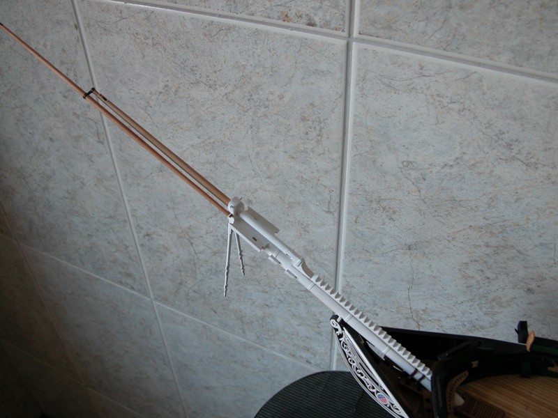 Największy problem miałem z takim zamocowaniem łańcuchów przytrzymujących bukszpryt, aby były napięte. Problem polegał na tym aby ich nie zerwać i jednocześnie nie sfajczyć całości w czasie lutowania ich do oczek i obejm. Ale jakoś się udało: