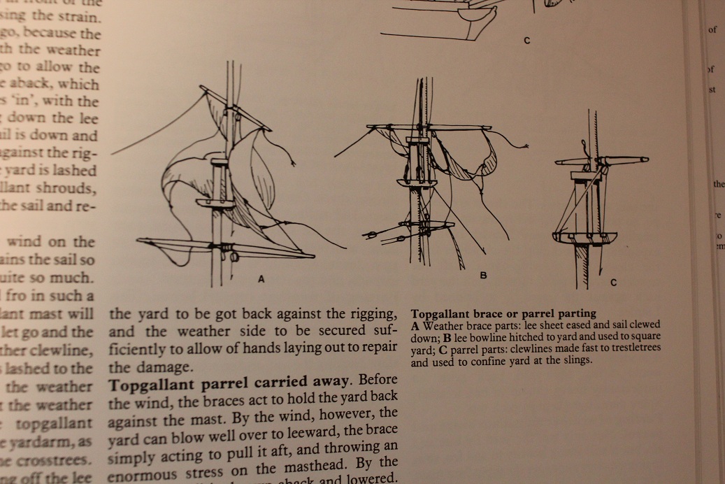 :) no Mareczku borykasz się z ciekawym problem i nie jesteś w tym jedyny. Też mnie to zawsze zastanawiało. Rysiek, a gdyby popatrzeć na problem z punktu żeglarza, takiego praktycznego podejścia., to prawdziwe będzie zdanie: wolne końce lin po zdjęciu żagla obkładano w różnych linowych "okach", knagach, hakach, krawatach. Teraz dla nas to jest problem gdzie i jak, więc modele budowane bez żagli z gołymi rejami tych lin nie mają. Ale na niektórych oryginalnych modelach z xviii wieku są liny takielunku ruchomego np. Victory 1744, Breda. Można tez znaleźć odpowiednie ryciny z "poradników" żeglarskich wydanych z końcem xviii czy tez xix. Dla przykładu wrzucę fotkę z książki "Semansip in the age of sail"