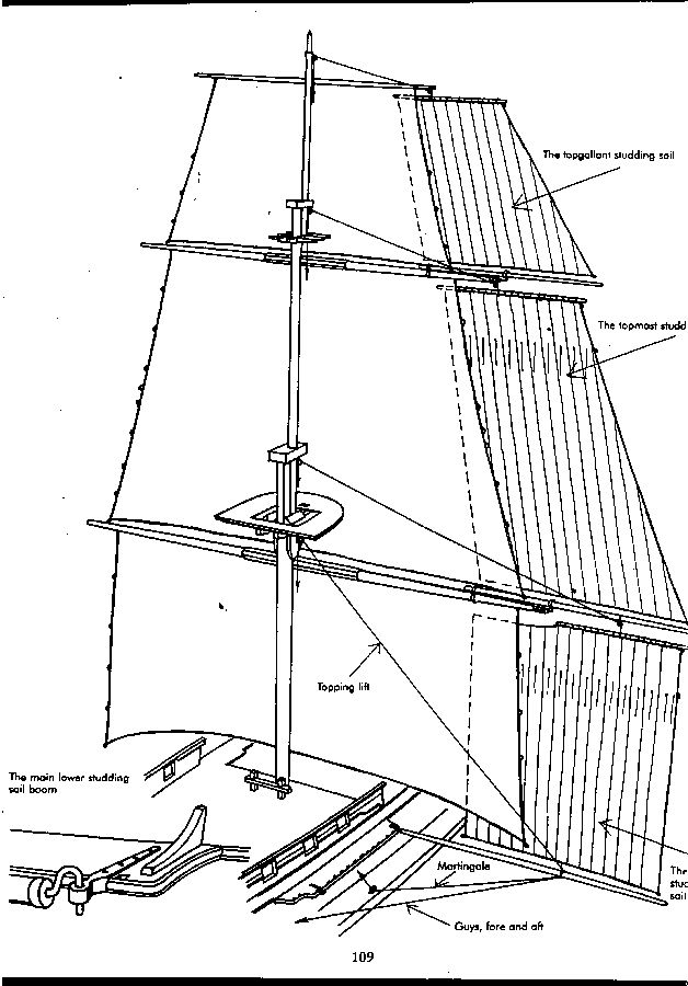 Też nigdzie nie znalazłem żadnej informacji co się działo z linami bocznych żagli po schowaniu wytyków.Być może pozostawały główne liny które mocowano do bloków na masztach.Wytyk zanim został wsunięty w swoje gniazdo musiał być pozbawiony wszelkich bloków i lin.Zobacz może ten schemat coś Ci pomoże.Trudna sprawa.Jakąś decyzję musisz podjąć i na tym polega zabawa.R