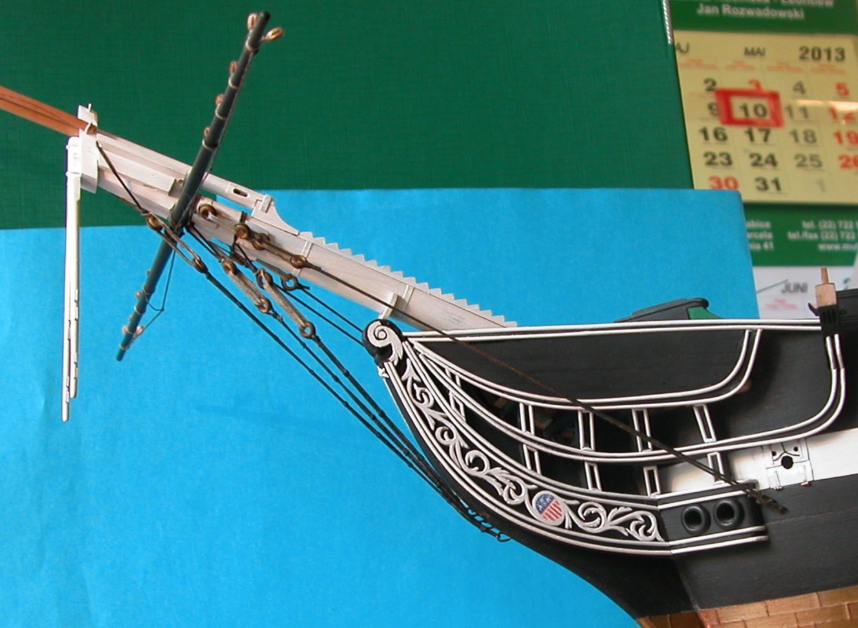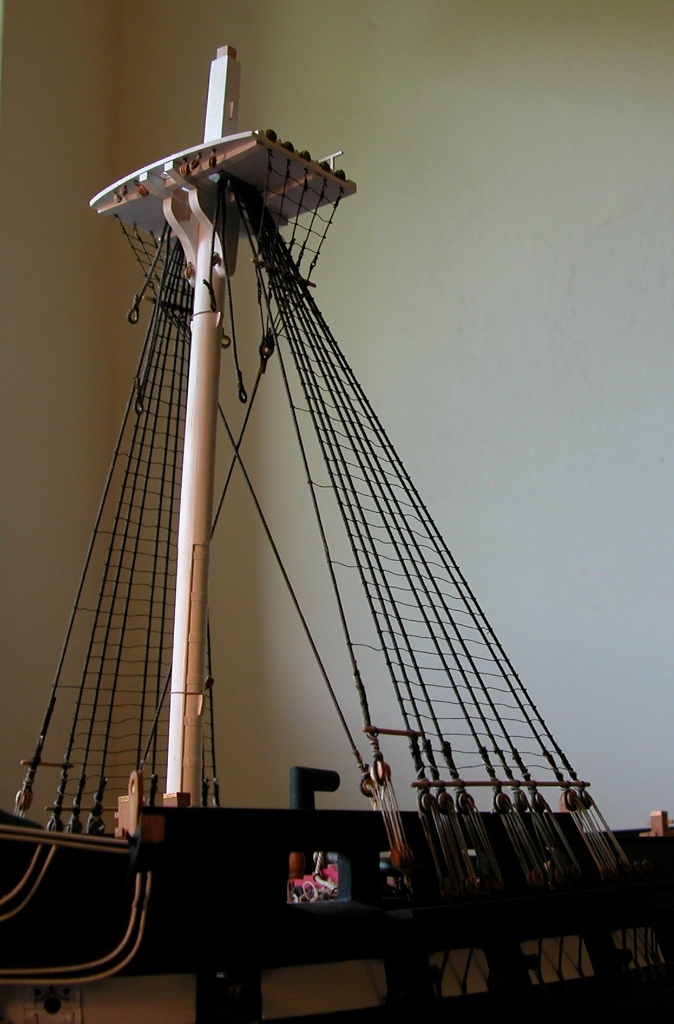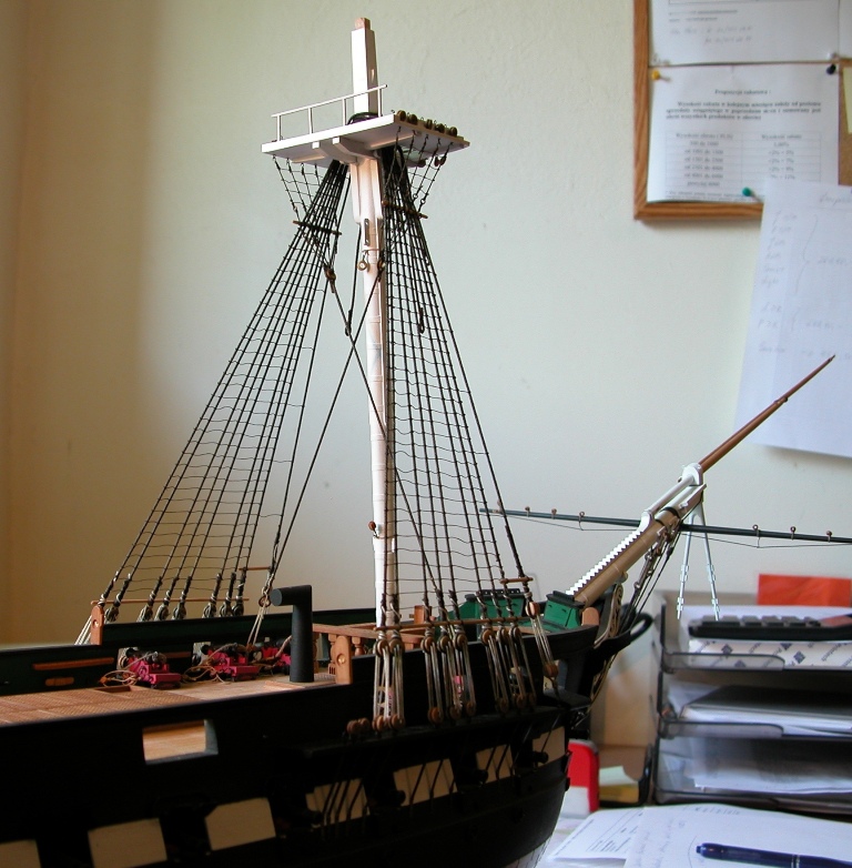 Po wyjaśnieniach Ryszarda dot. „top rope sheave” wszystko układa się w logiczną całość: przecież trzeba było jakoś wciągnąć na górę stengę i bramstengę, a ponieważ operacji tej nie wykonywano codziennie, naturalnym jest późniejsze usunięcie potrzebnych do tego lin – stąd nie ma ich na planach olinowania. Dzięki Ryszard.
