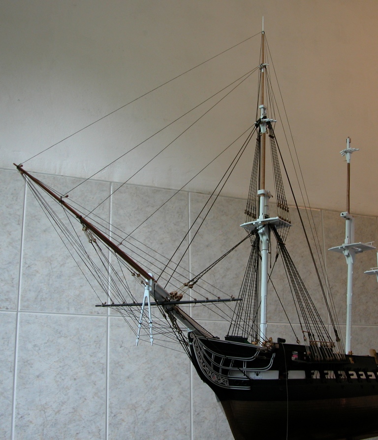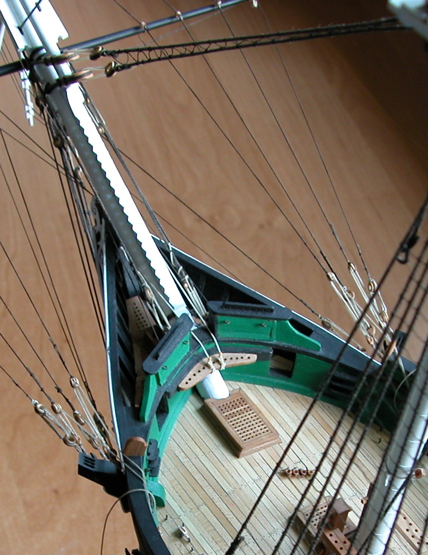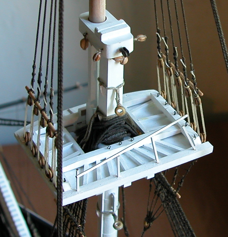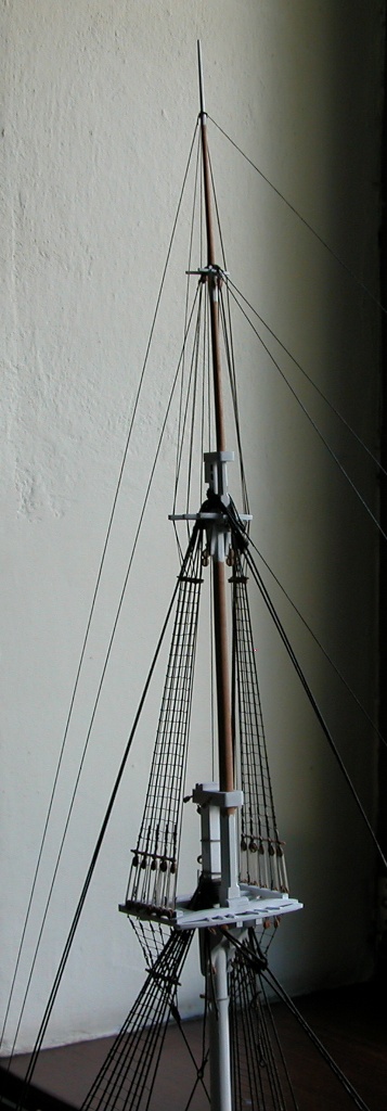 Przy okazji obnażyło niestety mój błąd - górna powierzchnia platformy marsa winna być szara !!!. Ze wstydem i skruchą przyznaję, że nie dopatrzyłem się tego na planach (a jest taka notatka, tyle że drobnym drukiem). Najgorsze jest to, że przy zamontowanych stenwantach i bramstenwantach nie ma praktycznie możliwości (dostępu) aby to przemalować. A strasznie mi się nie chce tego wszystkiego demontować. Muszę się przespać z tym problemem.