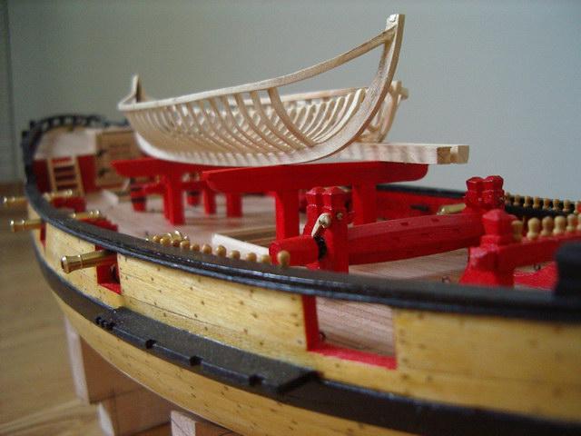 no i zrobiłem na kształt i podobieństwo tego co na Endeavourze. myślę, że jest OK. pod stojakami dawałoby się nawet przechodzić, jest sporo miejsca na obsługę armat, jest dojście do windy kotwicznej, jest nawet miejsce na fok (na szczęście nie ma bomu). jol od lewej burty będzie leżał na zapasowych drzewcach, łódź wielorybnicza będzie leżała w blokach. tyle w temacie, do zjazdu więcej nie robię.
