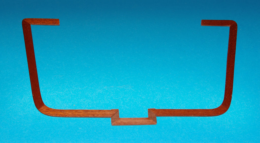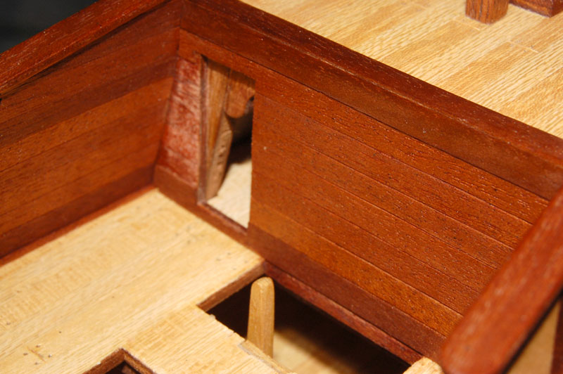 Pisałem, że nie miałem materiału (mahoniu) na oklejanie burt, widać to niestety na ścianie grodzi - tu użyłem bejcowanych listewek raminu (nawet brzozy nie miałem :evil:, a modelować się chciało :lol: ) - niestety kolor przybrał odcień inny od zamierzonego :twisted: .