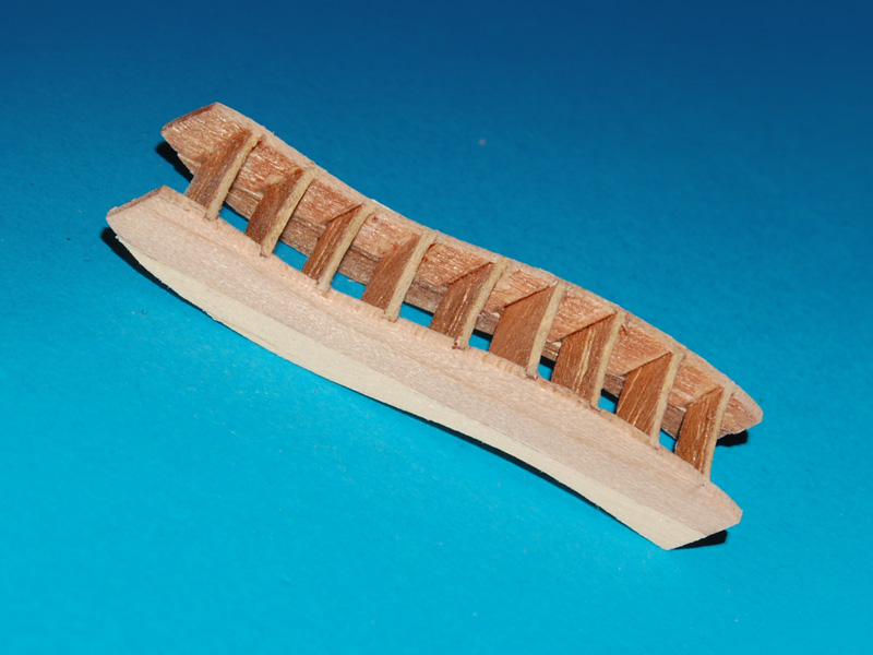 Jak pamiętam wszelkie koła i obręcze robiłem z forniru brzozy (trzy warstwy), wycinając cyrklem kreślarskim mniejsze koła (obręcz bezana i masztu na bukszprycie) i z listewek jak poniżej pozostałe obręcze. Teraz zrobiłem z obłogu mahoniu, z dwóch warstw, po sześć listew na warstwę.