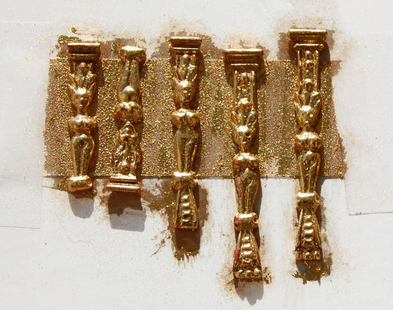 Pilastry przygotowałem do złocenia (małe detale, więc przykleiłem do taśmy klejącej, dalej » akrylowy podkład (cynober), » szelak (tak na wszelki wypadek ;) ), » mikstion,