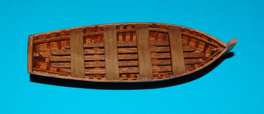 Budowałem ją bez kopyta i bez ożebrowania (być może zastosowałem dwie wręgi do podpory), po prostu do stępki z pawężą doklejałem planki, następnie listewki wewnątrz, tworząc drugie poszycie, później greting, ławeczki i zakończenie burt (parapet)