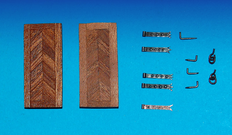 Zawiasy z blachy (puszka po konserwie), szerokości ok. 1,5 mm, gwoździowanie tym razem "wybite" punktakiem, zawinięte na szpilce, trzpień ze szpilki, pierścienie z drutu miedzianego, wszystko czernione.