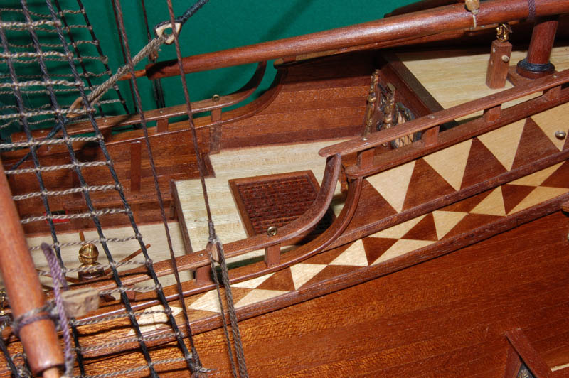 Po wklejeniu parapetu przyszła kolej na słupki relingu (analogicznie jak wcześniejsze słupki galionu) z mahoniowego krawędziaka 4 x 4 mm. Pewną trudność sprawiało przycięcie do właściwego kąta, a później wklejenie pomiędzy listwy