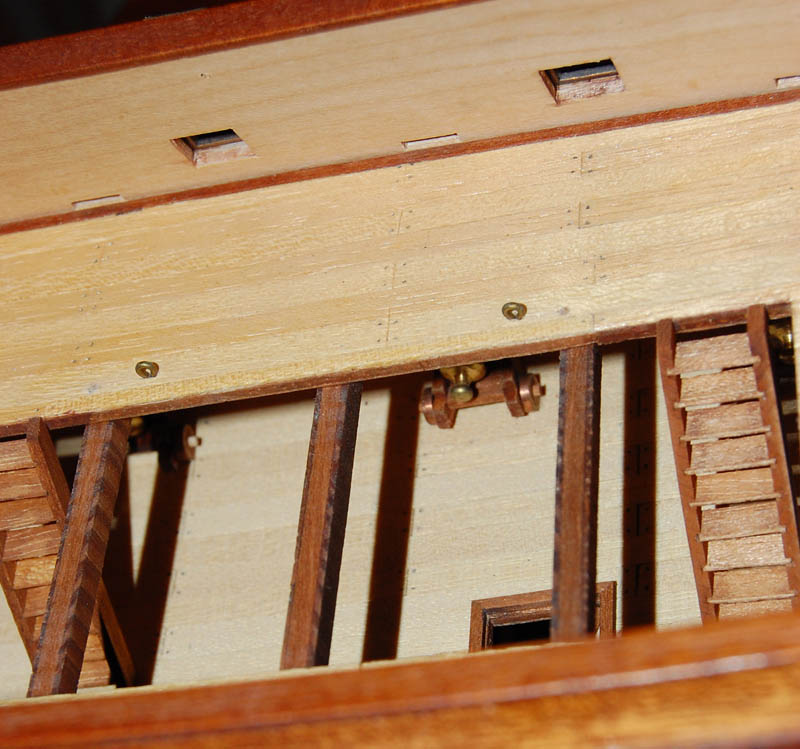 Typowo, umocowywano lodzie okretowe przywiazujac je na rusztowaniu zbudowanym tymczasowo z okretowych tzw. "spars" - drzewcow, glownie zapasowych rei, bomow czy gafow. Albo tez, jesli juz na podobnych jak Twe wspornikach, to poszerzano je tak, by ich "nogi" obejmowaly z zewnatrz greting tam sie znajdujacy i opieraly sie o deski pokladu raczej, albo nawet o reling od burty, a sama lodz byla podwieszana wyzej ponad gretingiem, ktory sam w sobie mial byc w zamierzeniach konstrukcja latwo demontowana w razie koniecznosci.