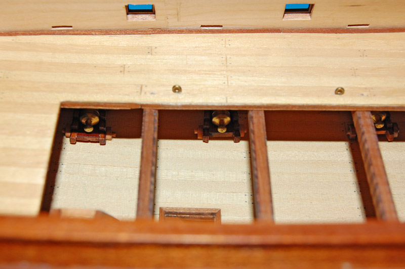 Naklejanie lewków na klapy (jak i spasowywanie) w pozycji stojącej modelu było dość utrudnione, teraz mając stelaż można model bezpiecznie "postawić" na burcie i naklejanie jest o wiele prostsze ;) . Zresztą nie wyobrażam sobie bez stelaża plankowania wewnątrz burt.