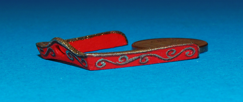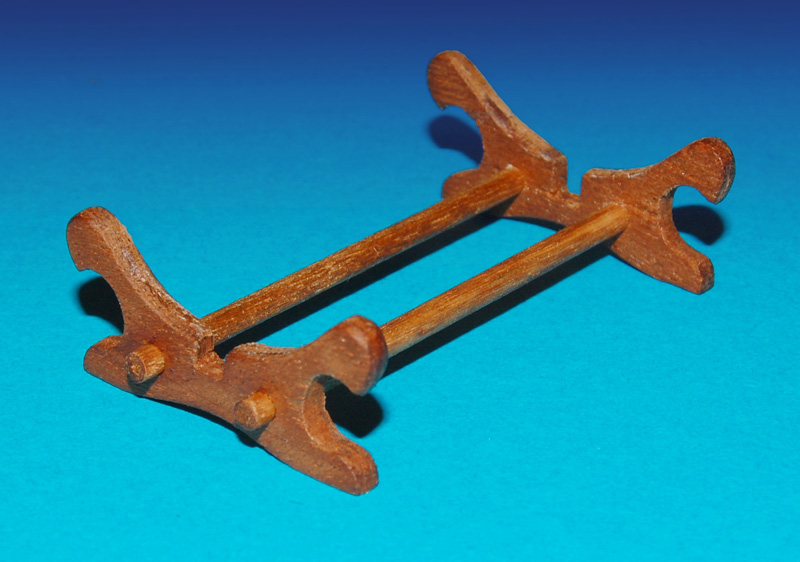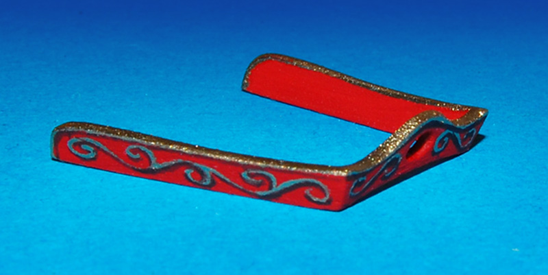 Listewki z forniru brzozy, na burcie 3 mm, na pawęży ok. 4,5 mm w najszerszym miejscu. Pomalowałem matowym akrylem (Renesans 08 cynober), następnie brązą (w proszku z medium malarskim) namalowałem ornamenty - podcienie kolorem brązowym (brązowy akryl mi się skończył więc zrobiłem mix cynobru z czarną - obie farby matowe).