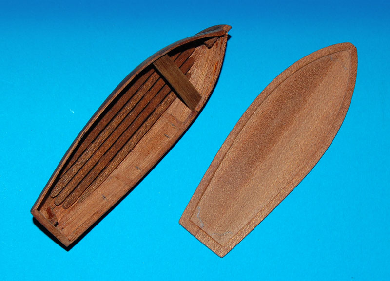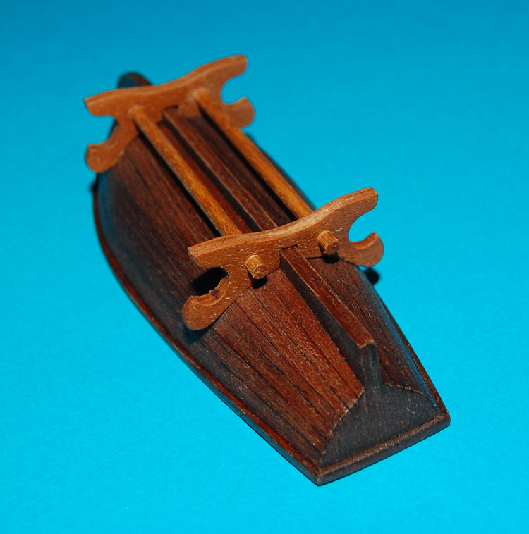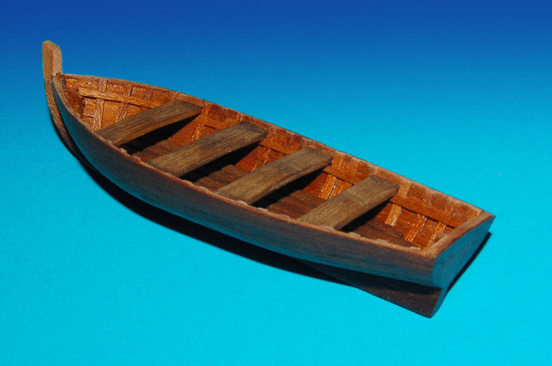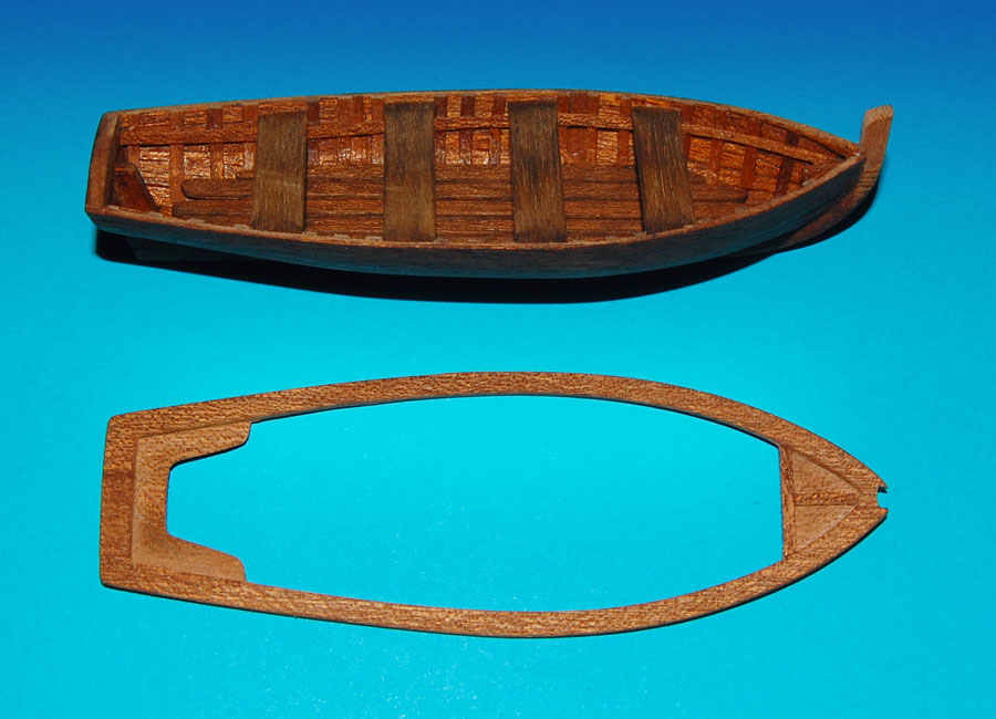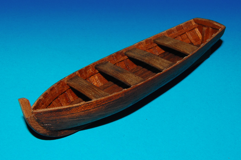Budowałem ją bez kopyta i bez ożebrowania (być może zastosowałem dwie wręgi do podpory), po prostu do stępki z pawężą doklejałem planki, następnie listewki wewnątrz, tworząc drugie poszycie, później greting, ławeczki i zakończenie burt (parapet)