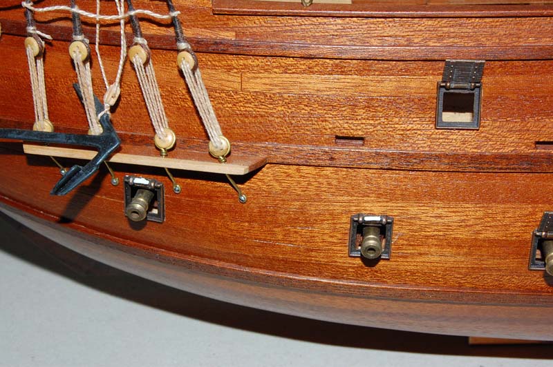 Na burtach namalowałem czerwone pasy. Tu dodam, że pod malowanie optymalnie najlepszym rozwiązaniem byłoby naklejenie ostatniej planki z jasnego forniru (takiego jak na detalu czyli brzozy), wtedy intensywność nasycenia czerwieni byłaby taka sama jak detalu na rufie.