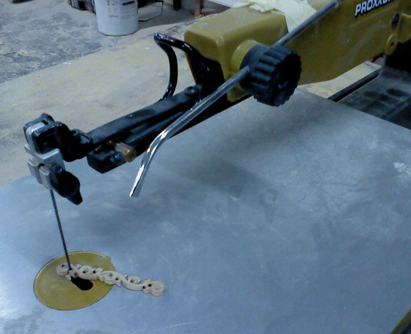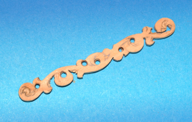Następnie nawierciłem kilka otworków na ażury i pomocniczych, w których będzie mógł wykręcić brzeszczot wyrzynarki - i przy pomocy owej wyciąłem ornament.