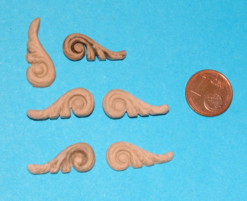 Zdobiąc kasztel dziobowy, brakuje mi jeszcze jednego detalu na łączeniu grodzi z burtą. Zrobiłem akant zakończony ślimacznicą (coś w rodzaju esownicy), który jest dwustronny o grubości parapetu.
