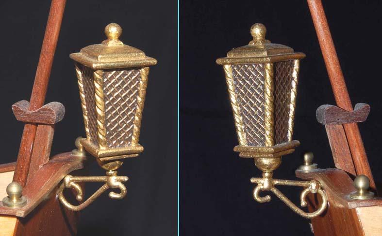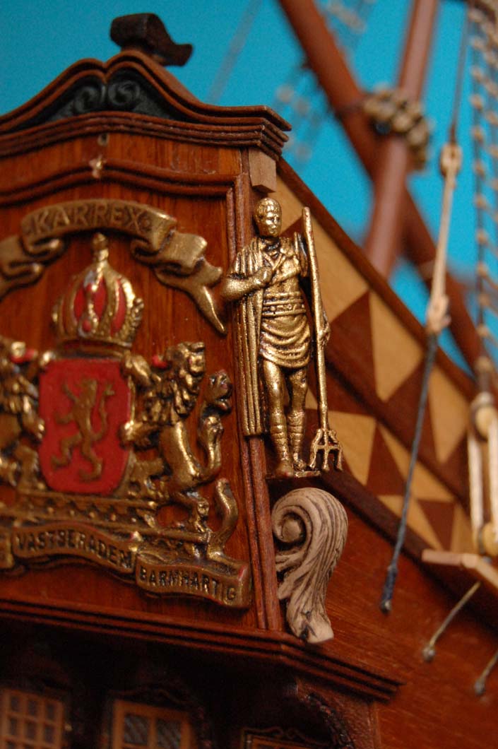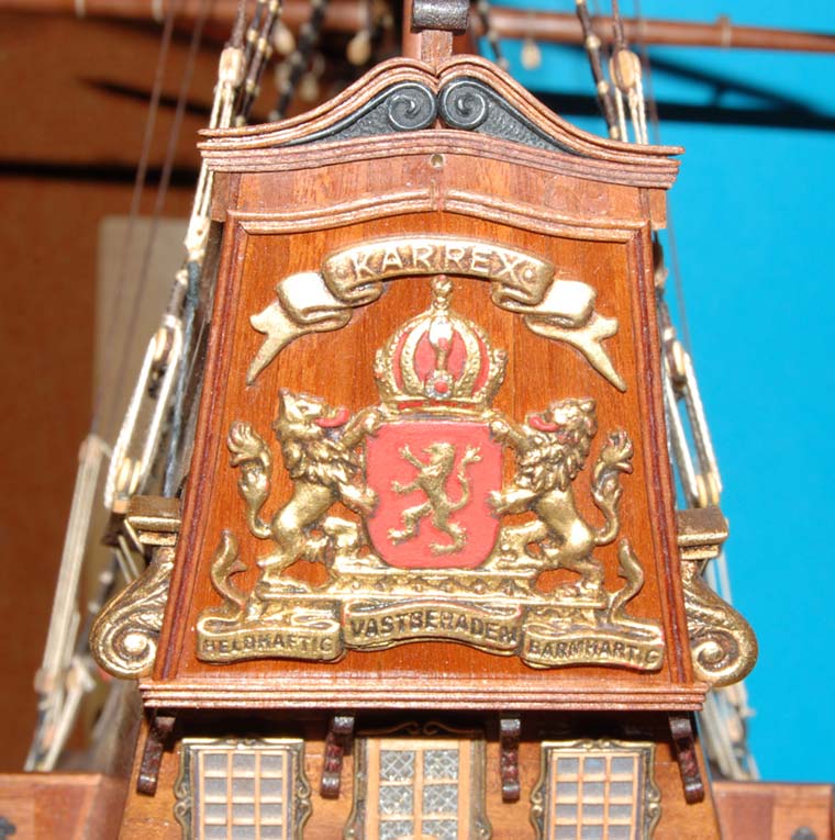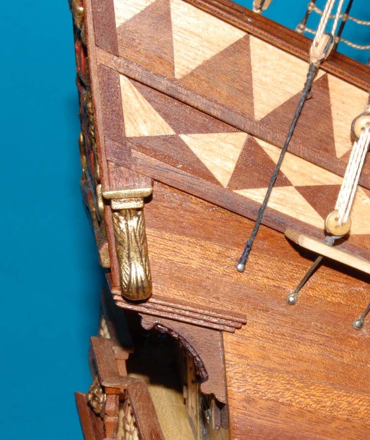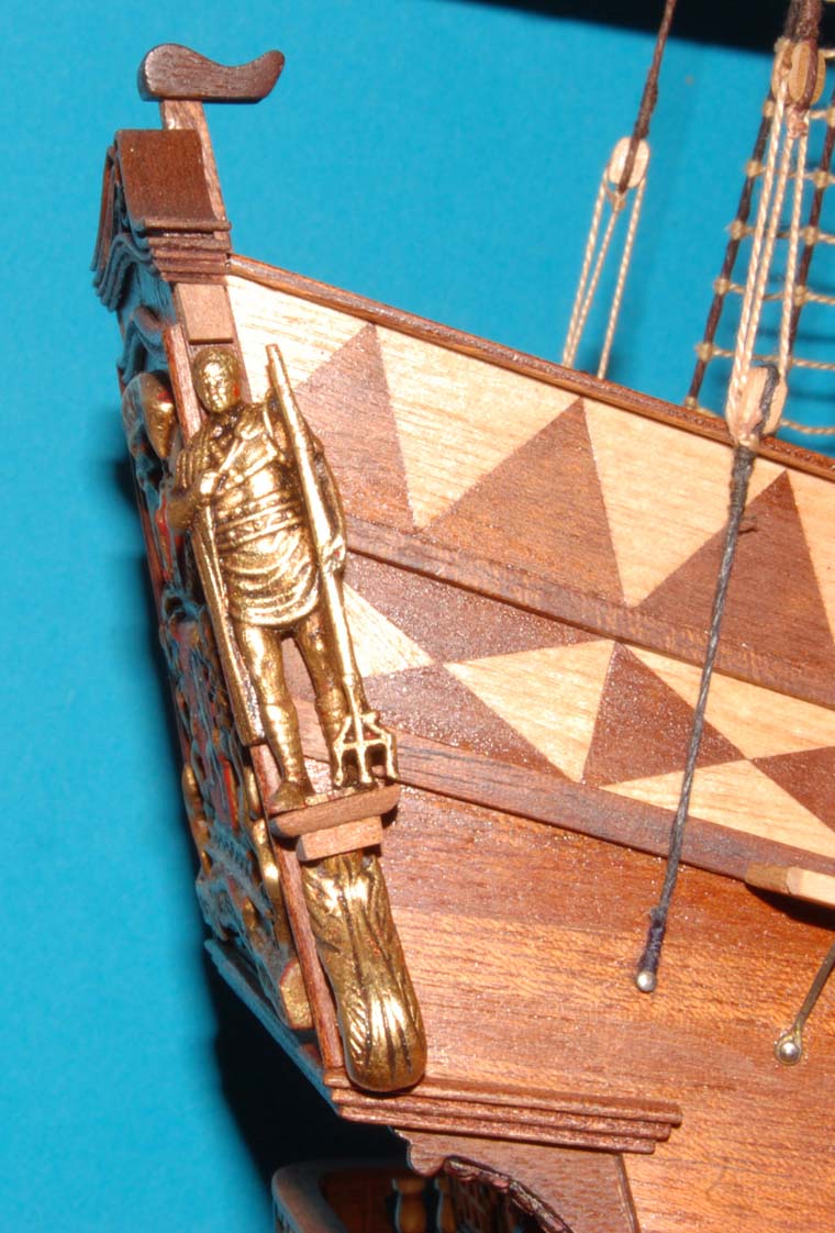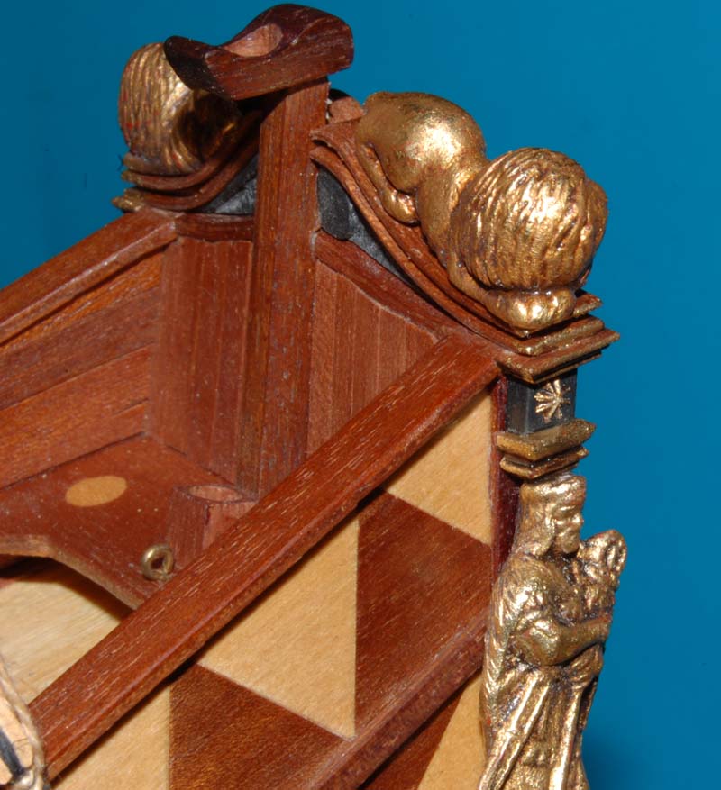 Z listewek forniru wkleiłem też "zaplecki" figur - było to potrzebne, aby wyrównać narożniki burt z ozdobną listwą na pawęży.