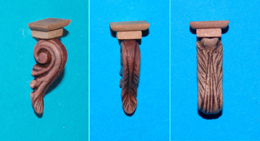 Jeszcze jeden detal konsoli - podstawa na której stanie figura. Powiem szczerze, że tu miałem znów dylemat czy konsolę z podstawą dać tak jak na zdjęciach poniżej, czy zgodnie z liniami listew na burcie (ta opcja bardziej mi odpowiada, lecz to wiąże się z innym uformowaniem figury - prawa noga zgięta). Druga sprawa to podstawa - dać ją prostopadle do burty, czy równolegle do linii wodnej - to jeszcze bardziej komplikuje układ nóg i stóp