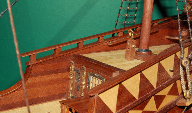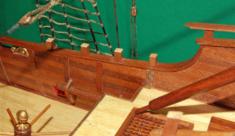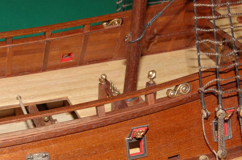 Po wklejeniu parapetu przyszła kolej na słupki relingu (analogicznie jak wcześniejsze słupki galionu) z mahoniowego krawędziaka 4 x 4 mm. Pewną trudność sprawiało przycięcie do właściwego kąta, a później wklejenie pomiędzy listwy