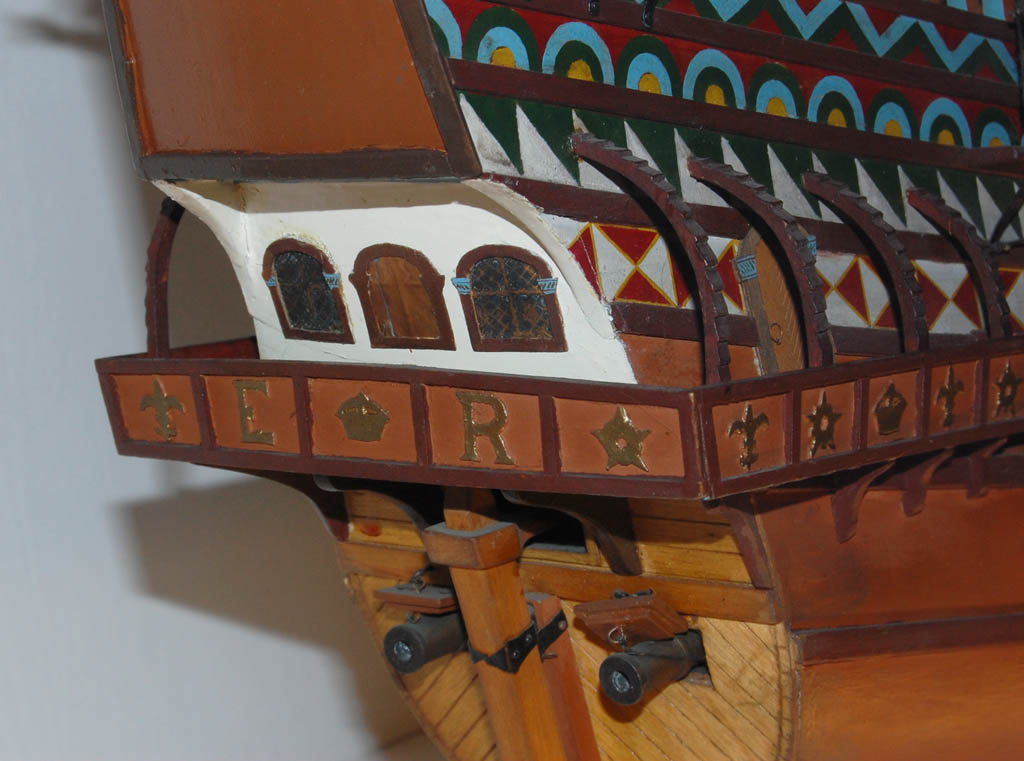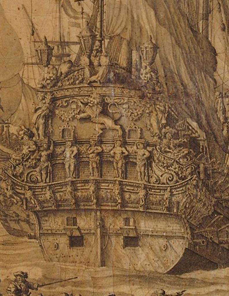 Z materiałów jakie udało mi się zgromadzić na temat galeonów od czasu "rozbicia" Wielkiej Armady, 1588, do obrazów Willema Van de Velde wynika, że ozdoby na lustrach były malowane lub płasko rzeźbione i polichromowane, i przedstawiały obrazy lub płaskorzeźby związane z nazwą, herby władców lub państw czy miast, wokół bogata ornamentyka rzeźbiona, polichromowana i malowana w rozmaitych miejscach.