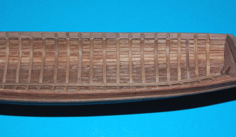 Wyrównałem krawędzie burt i nakleiłem listwy odbojowe (uformowane do kształtu na parze). Wewnątrz między wręgi wkleiłem kawałki listew (trochę dłubaniny ). Końcówki wręgów ścieniłem, żeby już nie pogrubiać krawędzi burt. Na to zostanie naklejona listwa mahoniowa, wykończeniowa.