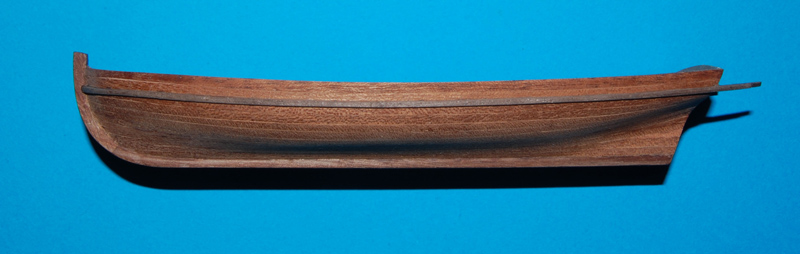 Listwy wewnętrzne (mahoń sapeli) wyciąłem wg kształtu zewnętrznych tylko z naddatkiem (szersze) i wkleiłem wykończając wewnętrzne krawędzie burt. Naddatek po wyschnięciu ściąłem i wyszlifowałem wyrównując z krawędzią. Nakleiłem też szerszy pasek forniru na stępkę (to w poprzednim poście).