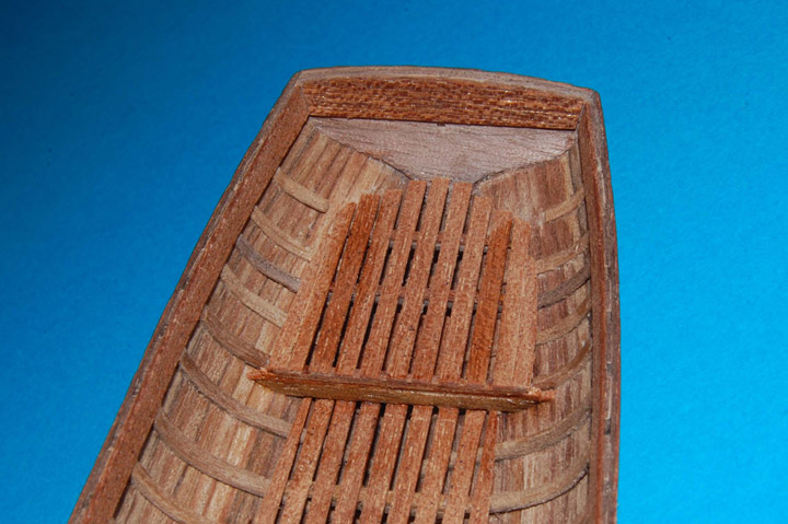 Kolejne elementy to gretingi (listwy z meranti o szer. 2 mm), "główny" i "rufowy" (sternika). Tak jak poprzednio najpierw zrobiłem szablony i wg nich wyciąłem gretingi. Niestety nie obyło się bez błędu, który wyszedł po zrobieniu gretingu rufowego. Wynikło to z tego, że przesunąłem ostatnią ławkę wioślarzy do tyłu* (tym samym skróciłem greting rufowy) i uwidoczniły się zakończenia listew gretingu głównego.